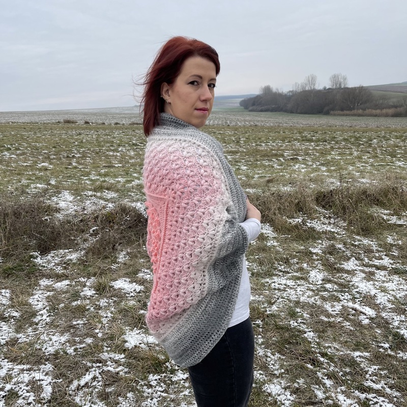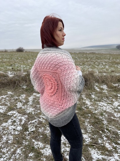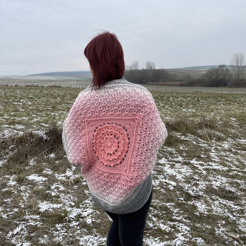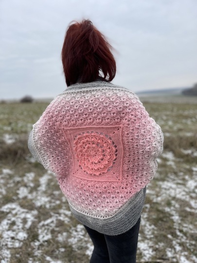 This beautifully textured shrug with the mandala in center is a unique addition to your handmade wardrobe.
