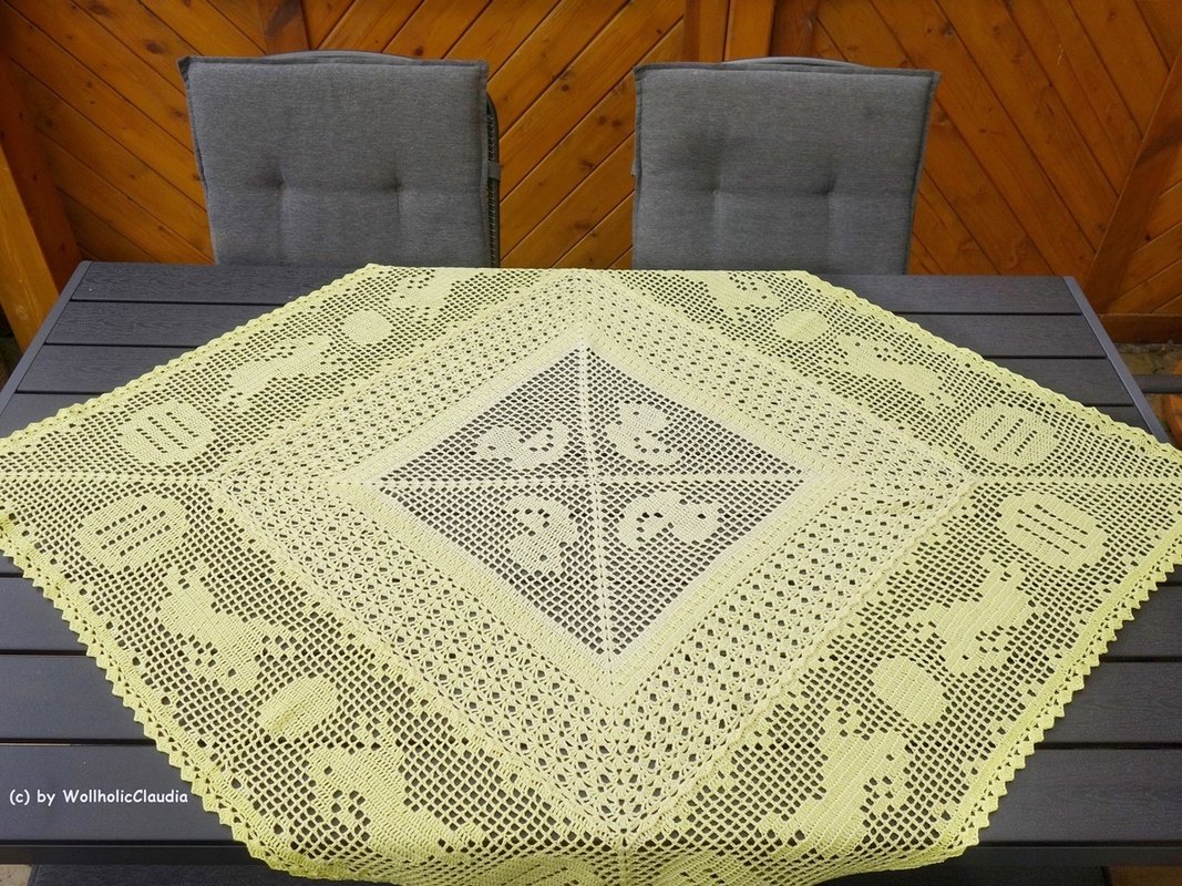 Diese wunderschöne Mitteldecke ist ein Mix aus Filethäkeln und dem herkömmlichen Häkeln und macht den Ostertisch zum Hingucker. Du kannst eine kleine oder eine große Version anfertigen.