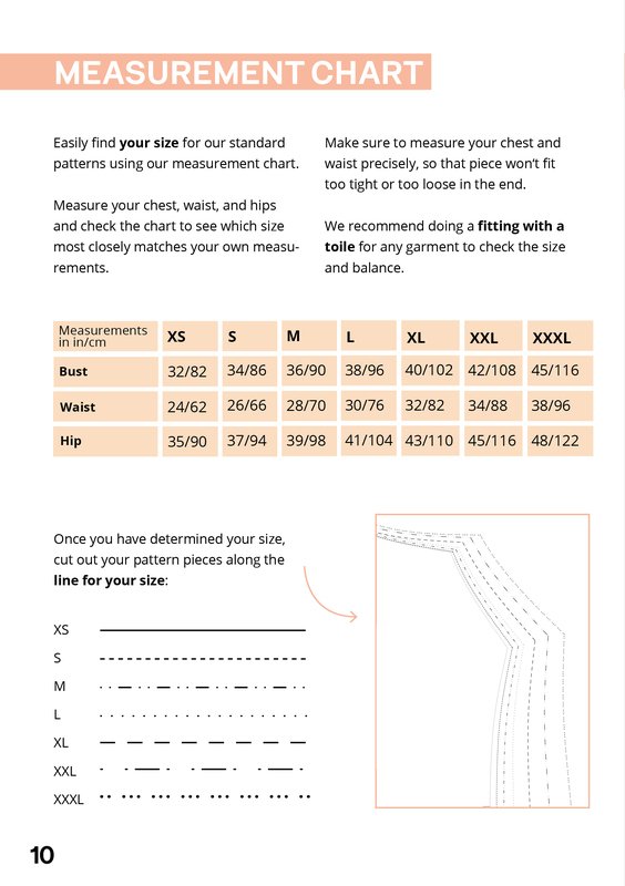 The sizes XS-XXXL are included as a sewing pattern. The exact measurements of the sizes you can see in the size chart in the pictures.