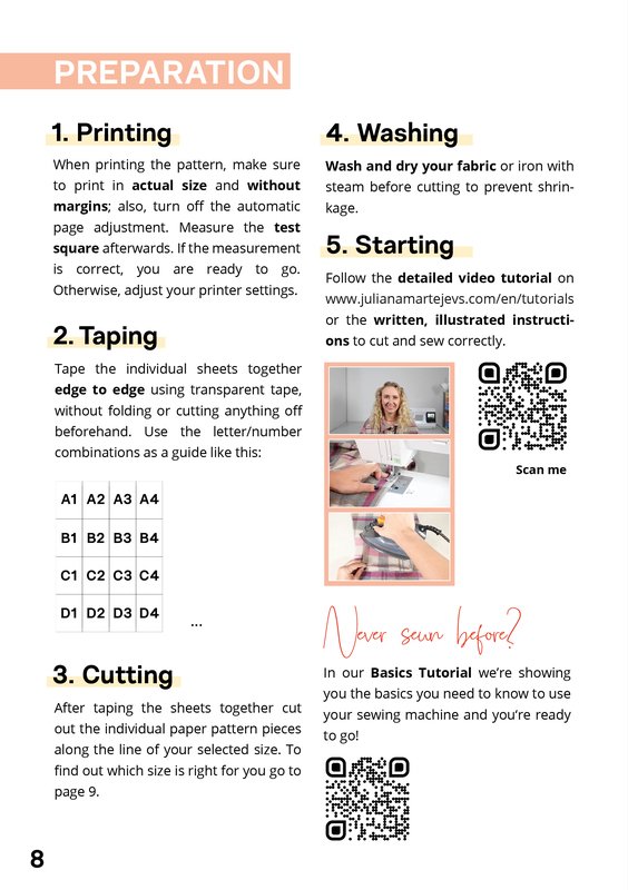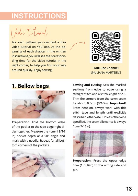 Once you've downloaded your pattern, glued it together, and gathered your materials, look forward to the fun production process that follows! If you've never sewn before, start by watching our Sewing Machine Basics video tutorial on our YouTube channel. In just a few minutes, you'll learn all the basics you need for any JULIANA MARTEJEVS sewing project. Then just click on the video tutorial that matches your product and get started!
