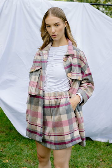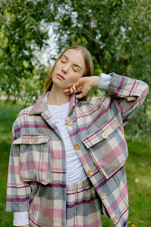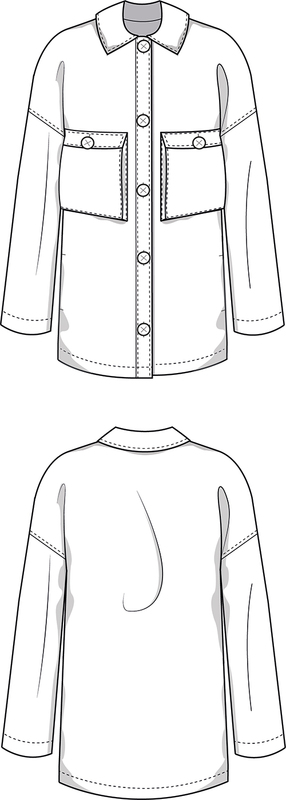 The DIY coat in the style of a shacket (jacket meets shirt) with bellows pockets you make from a cozy coat fleece in one of two possible lengths (waist length or seat covering) in one of the sizes from XS-XXXL.