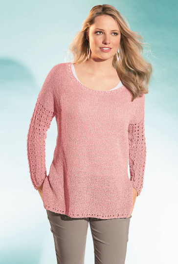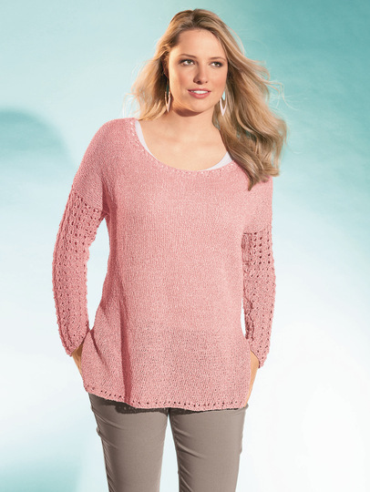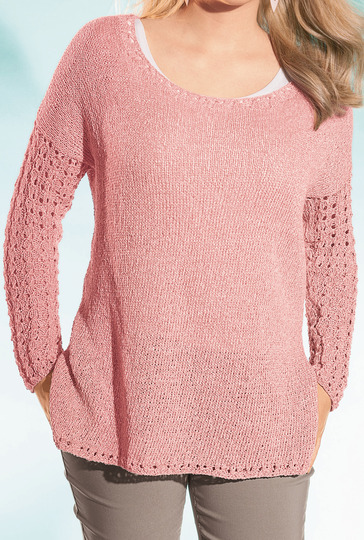 Ein außergewöhnliches Modell ist dieser roséfarbene Pulli. Er besteht aus einer schlichten, glatt rechts gearbeiteten Körperpartie und ganz im Lochmuster gestrickten Ärmeln. Dieses Lochmuster ist auch an Saum- und Ausschnittblenden zu finden. Für den Sommer darf es auch gern ein weiter, runder Halsausschnitt sein. Ebenfalls ganz sommerlich: das Baumwoll-Leinen-Garn. Seitenschlitze machen den lockeren Stil des bis über die Hüften gehenden Pullis perfekt. Eine Anleitung ist für die Größen 42/44, 46/48, 50/52 und 54/56 vorhanden.