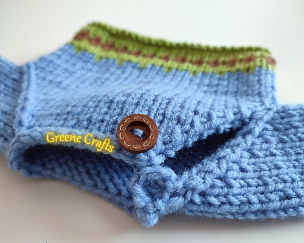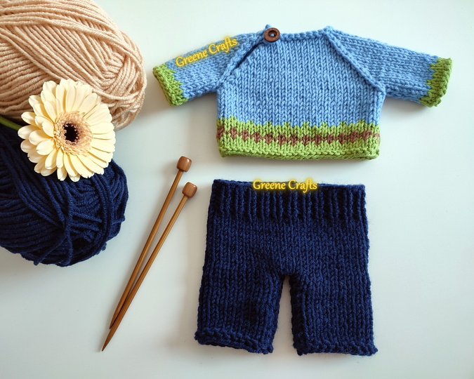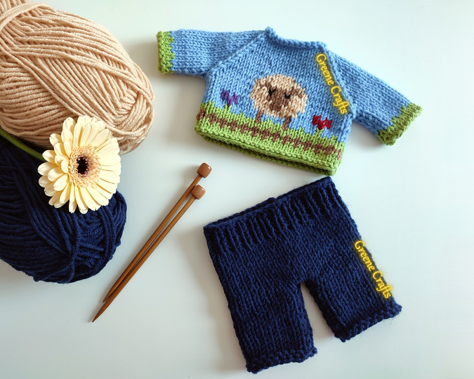 This cute outfit looks great both on knitted bunnies and on child's playdolls.