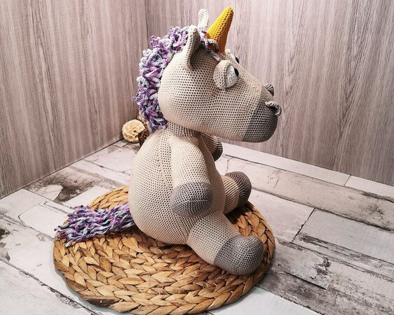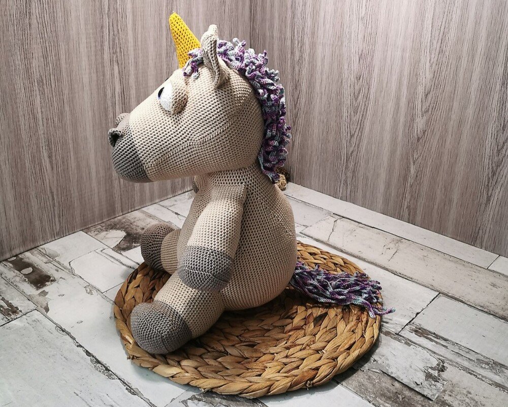 The finished unicorn will be about 42cm. Of course, the size can vary depending on whether you crochet tight or loose. The choice of wool is also important. I crochet with cotton yarn 125m/50g (100% cotton).