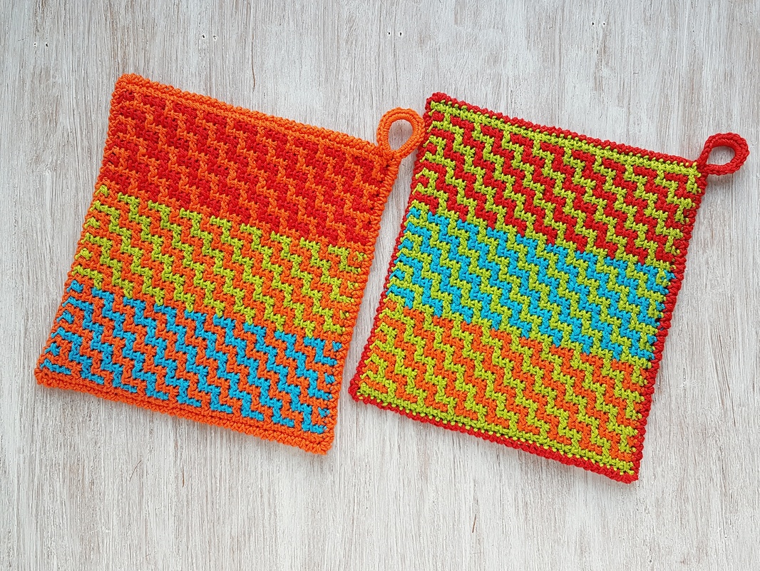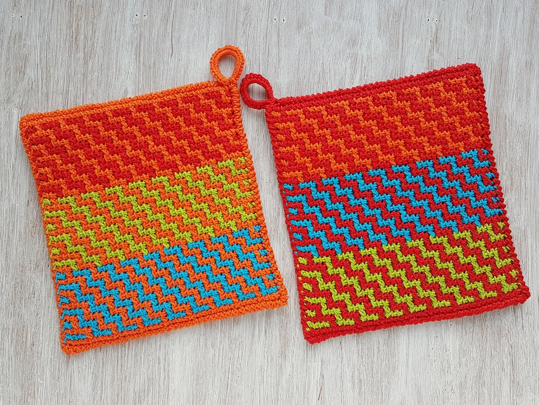 When each side of the potholders is made in a different main color, 50 g. per color is needed.