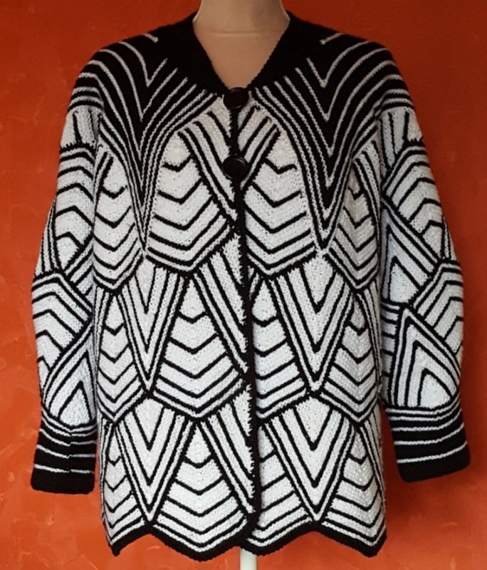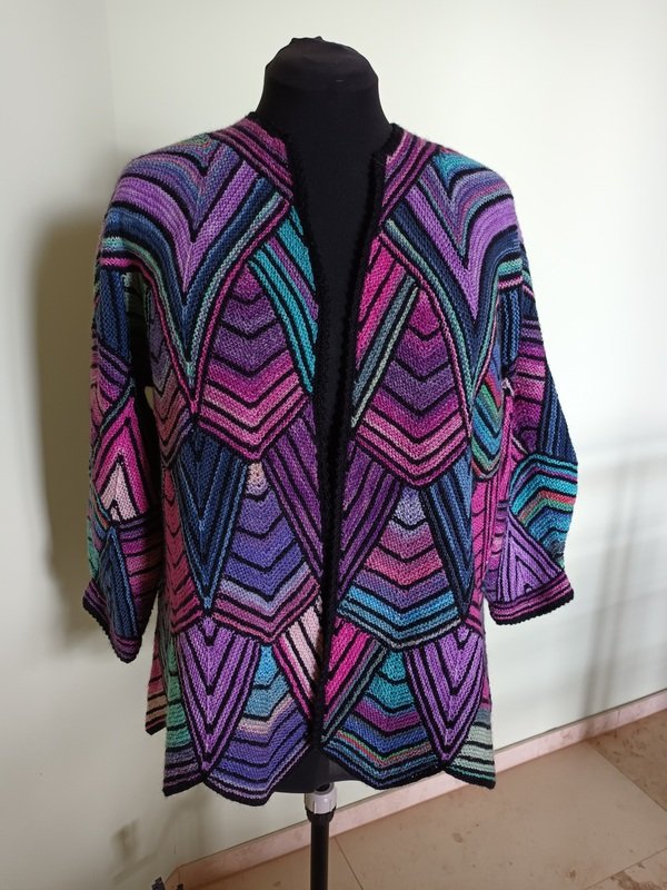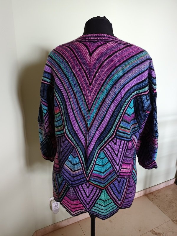 Strickjacke in außergewöhnlicher Optik. Nahtlos in einem Stück gestrickt, kein zusammennähen. Nur rechte Maschen.