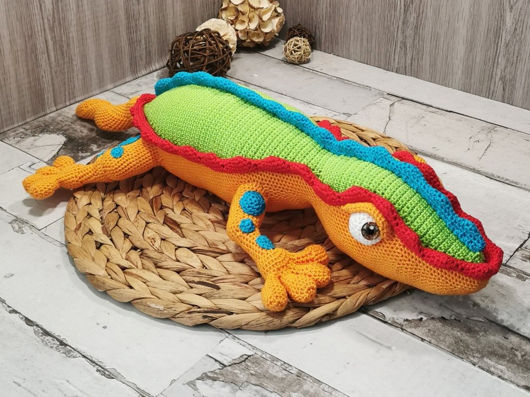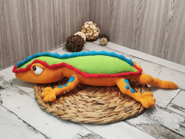 The finished lizard will be about 58cm. Of course, the size can vary depending on whether you crochet tight or loose. The choice of wool is also important. I crochet with cotton yarn 125m/50g (100% cotton).