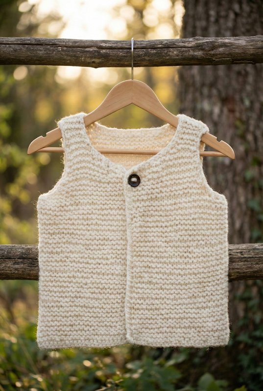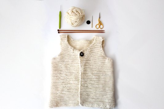 The vest is worked in garter stitch with one wooden button at the front. Back and both front pieces are knitted separately and then seamed at shoulders and sides.