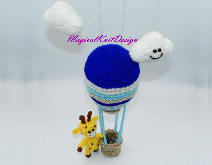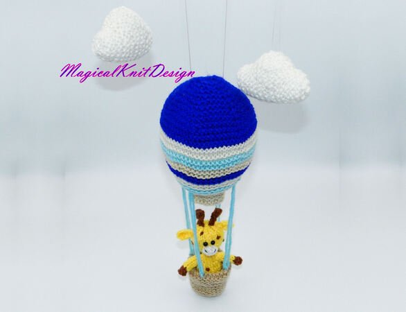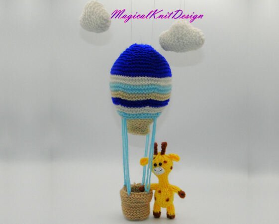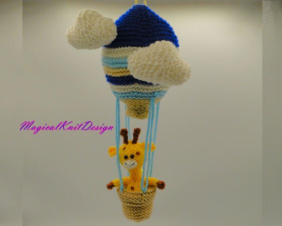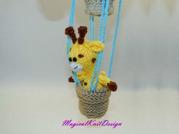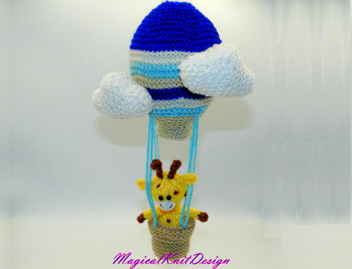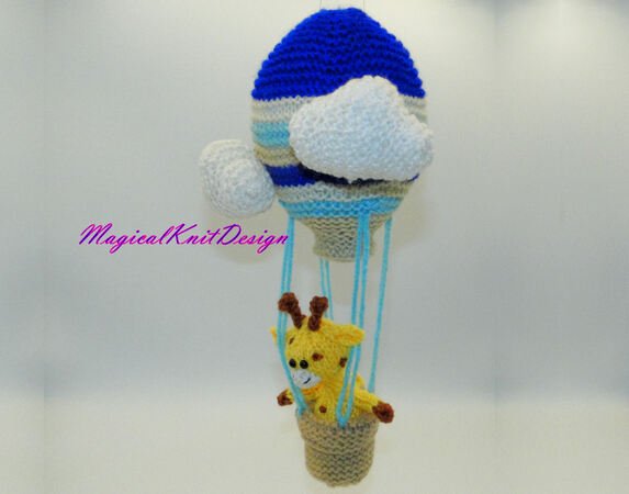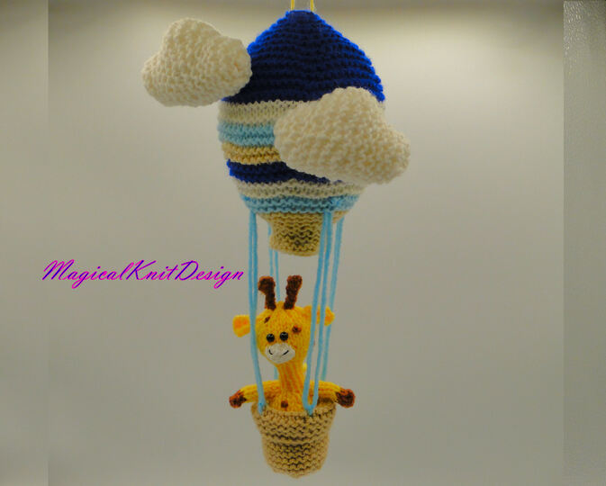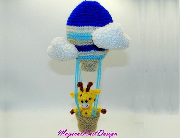 This is Ginger the giraffe on the air balloon flying in the middle of the clouds, knitted flat with straight Knitting needles, easy to follow pattern, with row by row written instructions and photo-tutorial.