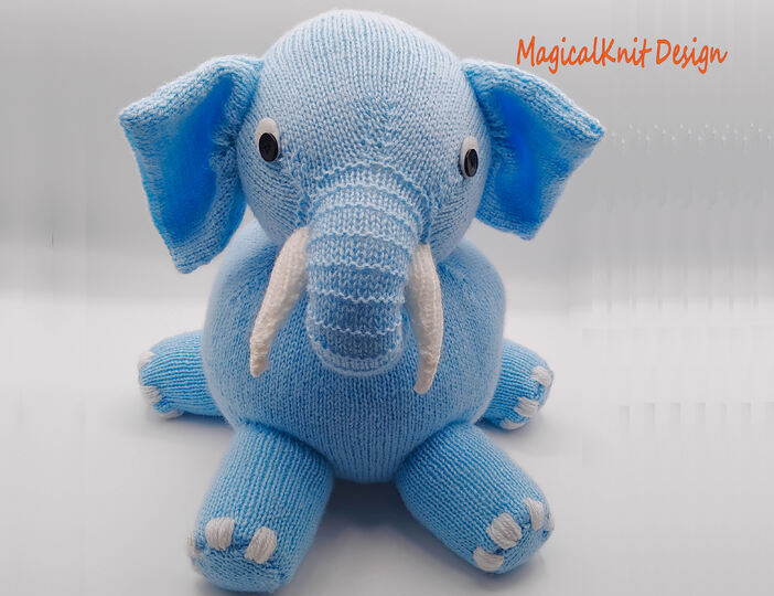 This is Theo the blue elephant knitted flat on straight Knitting needles, easy to follow pattern, with row by row written instructions and photo-tutorial.