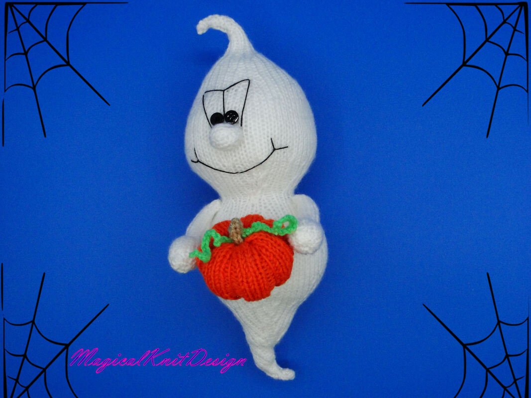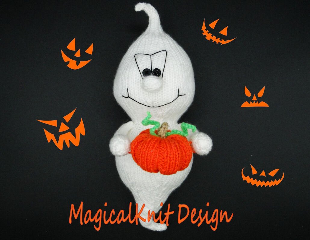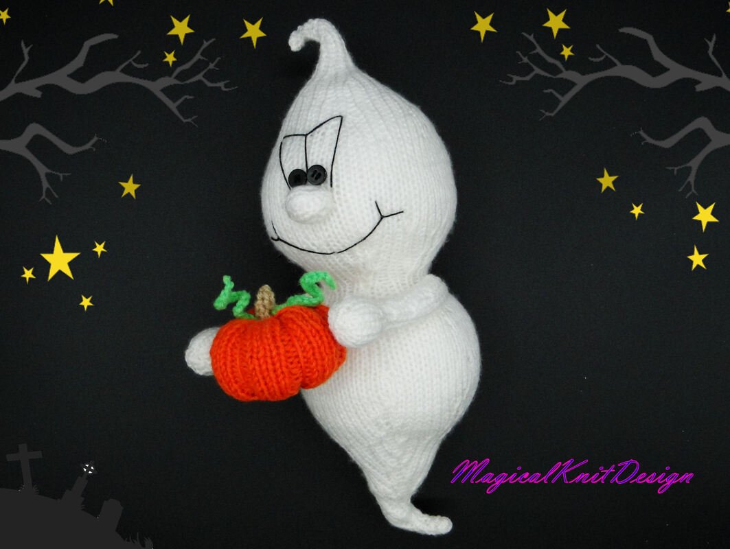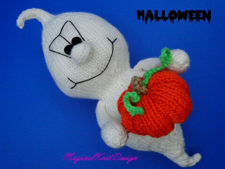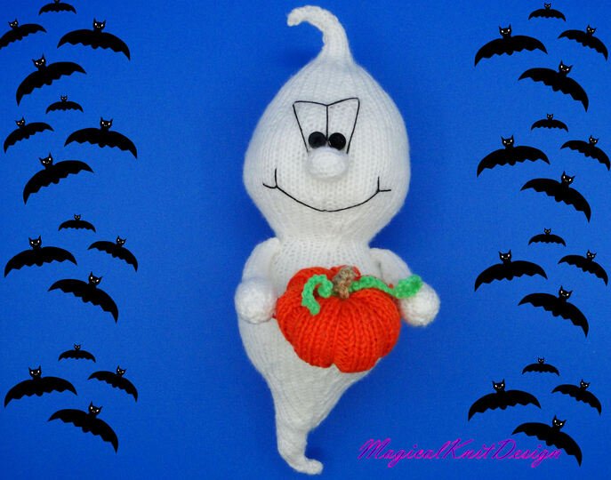 This is Blinky the happy ghost knitted flat on straight Knitting needles, easy to follow pattern, with row by row written instructions and photo-tutorial.