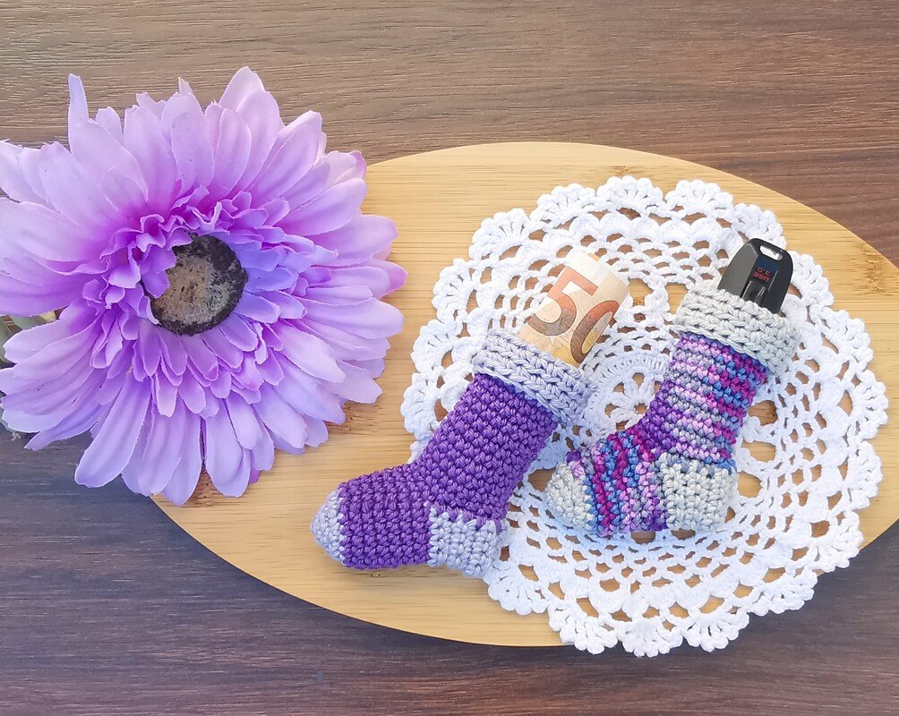 These cute stockings can be used as a gift card holder. Use double sided tape to secure on any item. (not liquid glue). You can also use them as a „sleeping bag“ for an USB-stick. If you crochet a little loop, they make a nice key fob. You can use all kinds of yarn scraps. Just be creative with the colors.