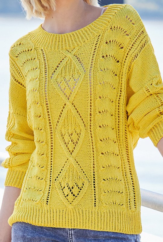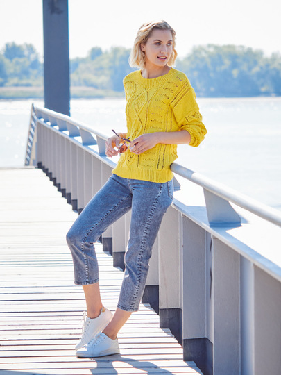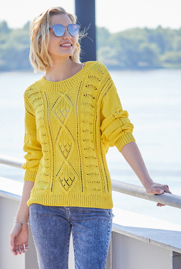 Gute-Laune-Pulli für die ersten warmen Tage. Das leuchtende Gelb des Pullovers steht nicht umsonst für Wärme, Optimismus und Heiterkeit. Und für Kreativität! Dass davon jede Menge in den Pulli geflossen ist, sieht man nicht nur, sondern man merkt es auch bereits während des Strickens. Lochmuster, Loch-Rautenmuster und Pfauenmuster bieten jede Menge Abwechslung und Strickspaß. Insgesamt benötigt das Kunstwerk zwar ein wenig Aufmerksamkeit, aber die klare Strickschrift in der Anleitung hilft dabei, stets den Überblick zu behalten. Gestrickt wird in einzelnen Teilen von unten nach oben. Sind alle Teile fertig werden noch die Nähte geschlossen - am besten nimmt der Lacepulli dann noch ein kleines Bad und wird schön glatt ausgestrichen und liegend getrocknet. Dabei entfaltet das Ajourmuster seine volle Schönheit.