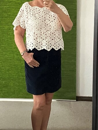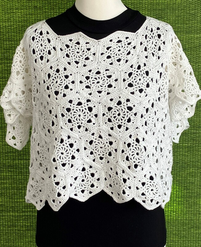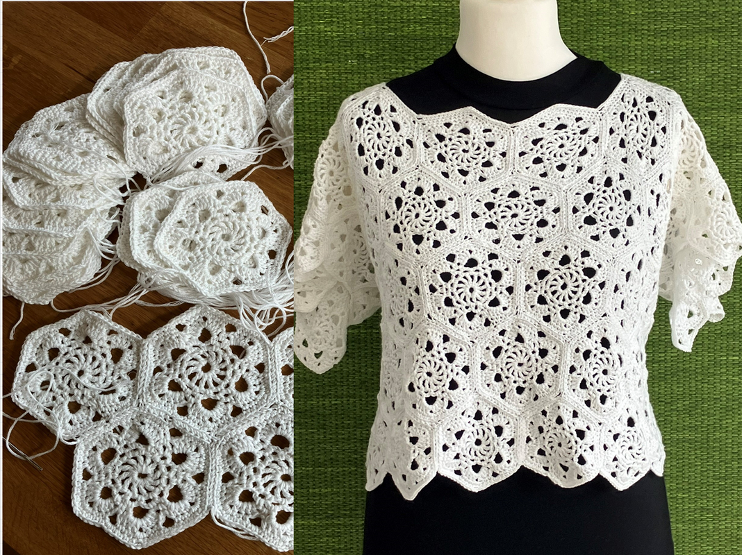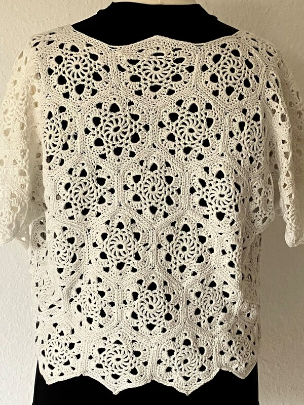 Grannys don't necessarily have to be square and colourful, they can also be hexagonal and monochrome - as chosen here. I think this looks particularly classy. The shirt is cut in such a way that a possible tummy can be faked away, because it falls straight down from the bust and thus sits loosely and timelessly beautiful. You can simply wear the shirt next to your skin or dress it up with a plain jumper.