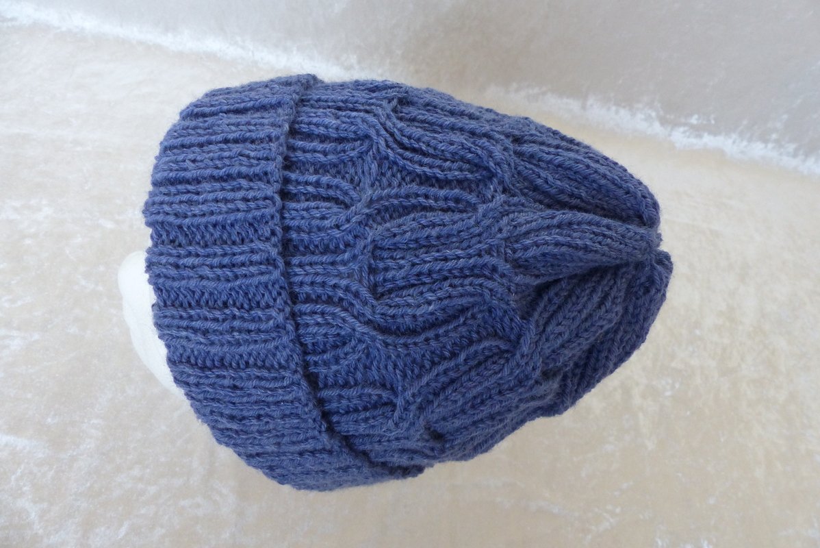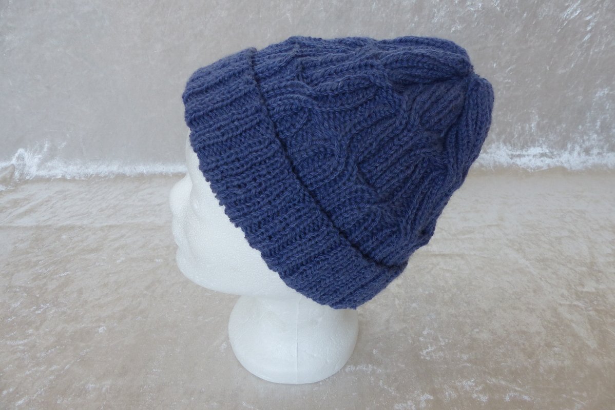 Durch das Bündchenmuster bleibt die Mütze schön in Form und passt sich gut an. Ein Zopfmuster unterbricht das Bündchenmuster.