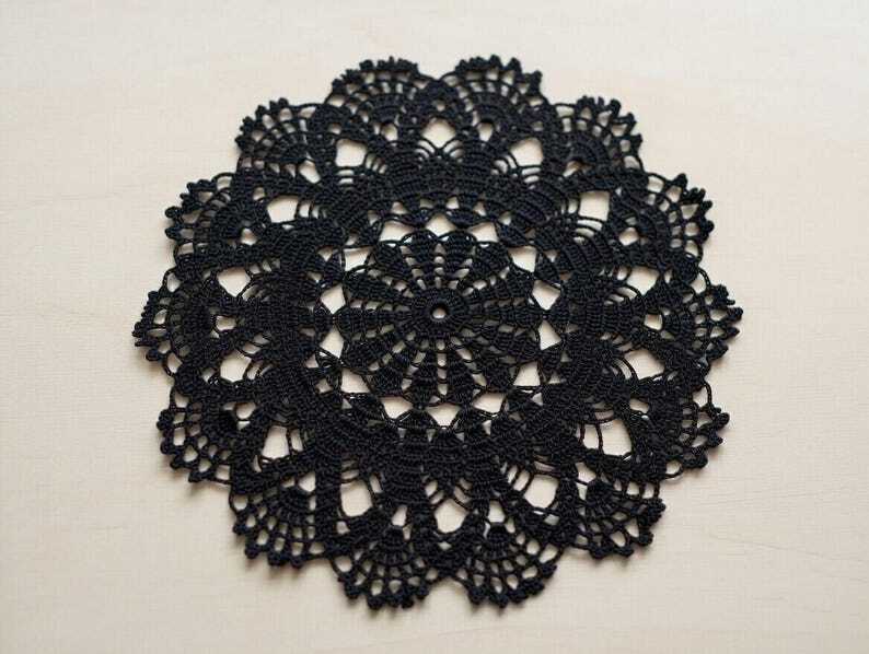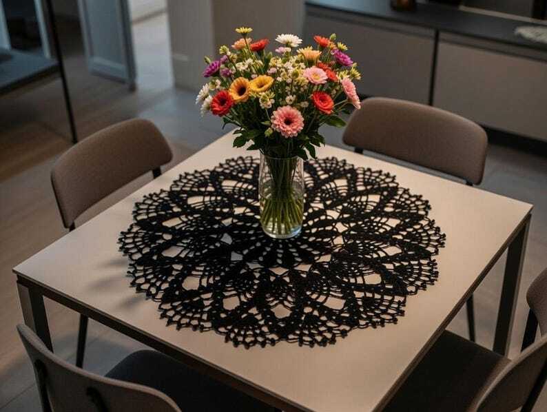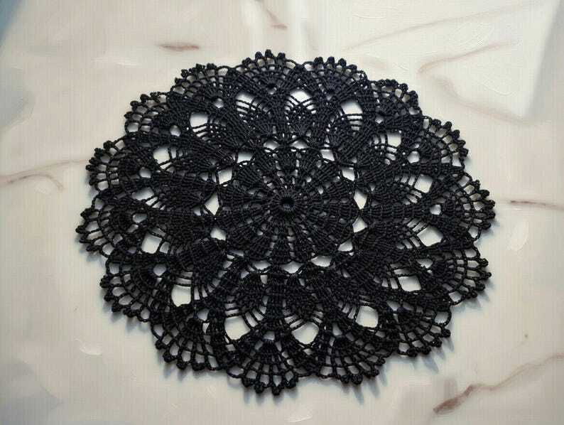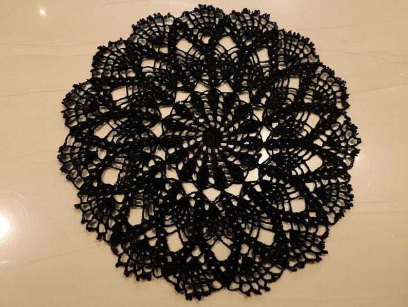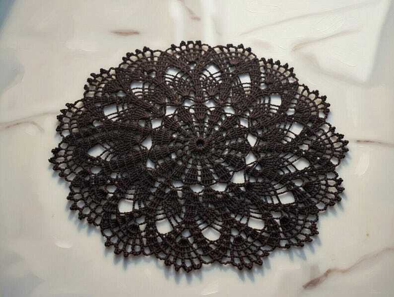 Final size may vary depending on yarn and tension. With the recommended materials, the finished doily measures approx. 20–25 cm (8–10 inches) in diameter.