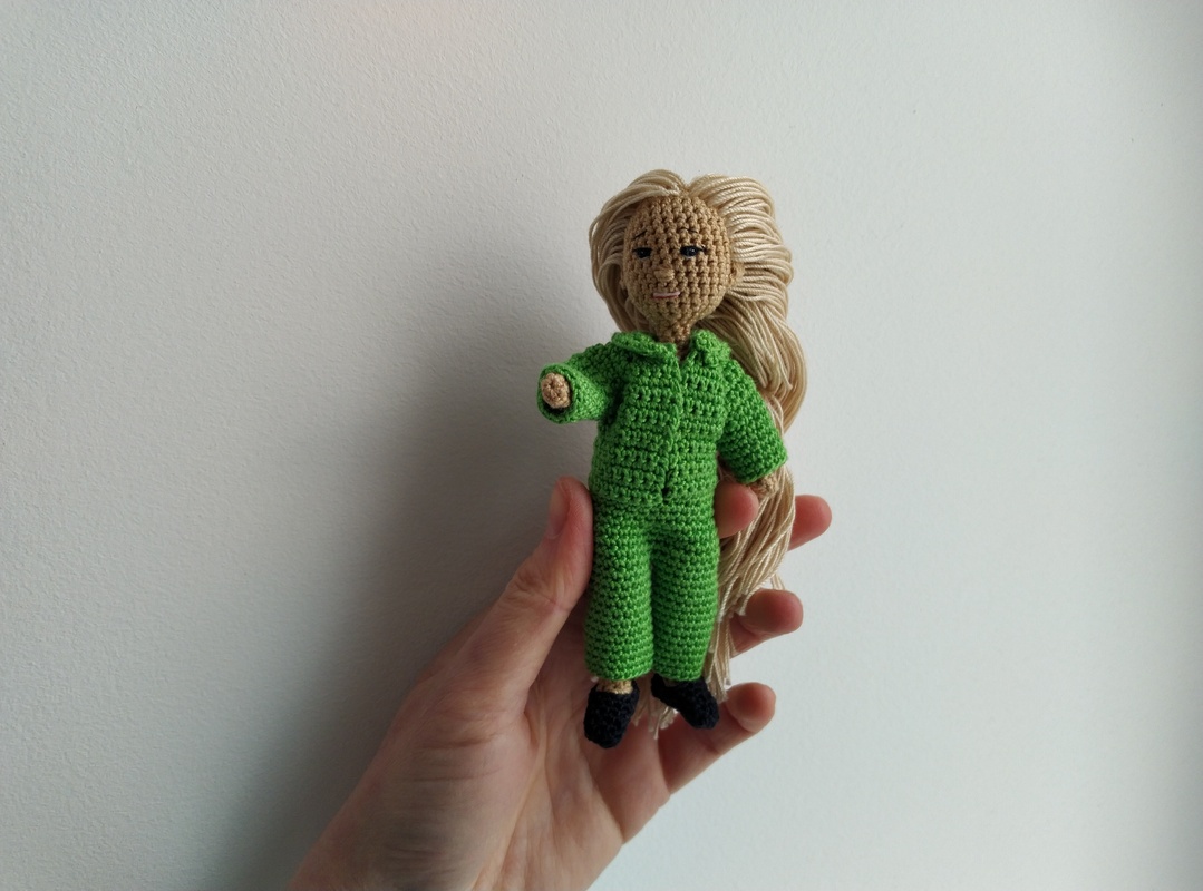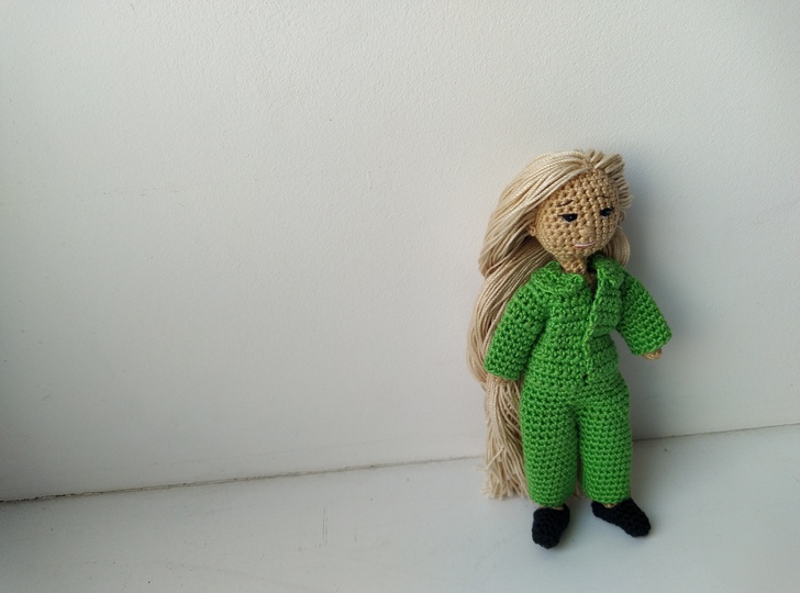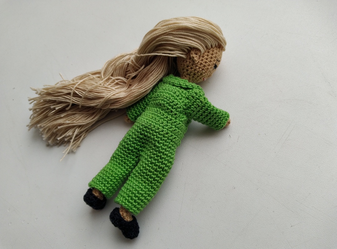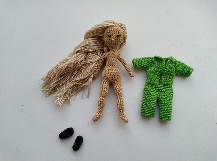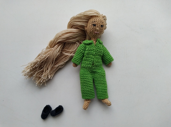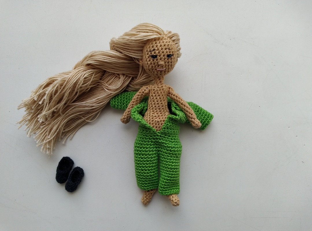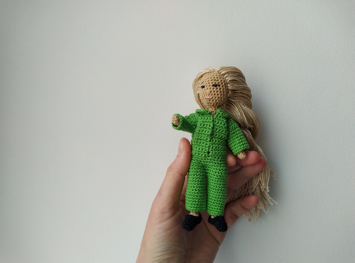 So happy to introduce to you a crochet pattern for a 5-inch doll that can bend its arms and legs and take on various poses. The pattern shows how to crochet a realistic female body (doll-like, without intimate details), how to prepare and insert a frame inside the crocheted body, and how to dress the doll in a cute green playsuit and black slippers. The clothes and shoes can be taken off and put back on the doll. The pattern also shows how to make the doll's hair. All that's left is to embroider the eyes of your choice (a couple of stitches of black thread symmetrically from the nose) and the mouth (one stitch of pink thread).