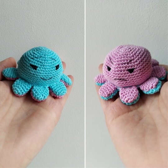 Relieve stress by letting the Reversible Octopus tell friends, family, or coworkers how you are feeling. The perfect work-from-home tool to let friends and family know when not to bother you! Happy – come on in, and Angry – come back later! Choose a color according to your desire, which color will be happy and which color will be angry. In the pattern: blue is happy, pink – angry.