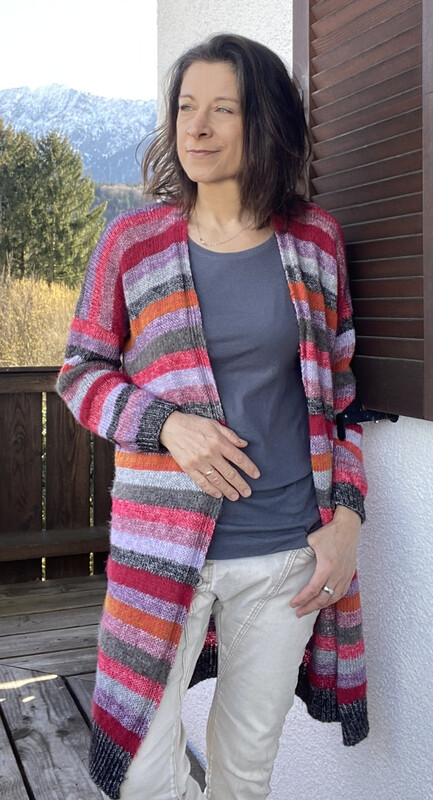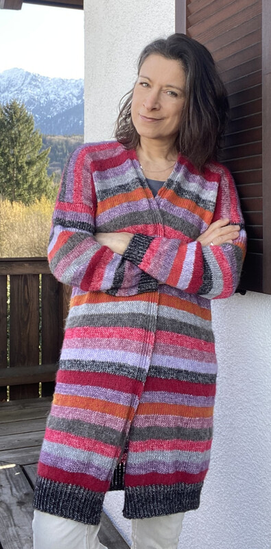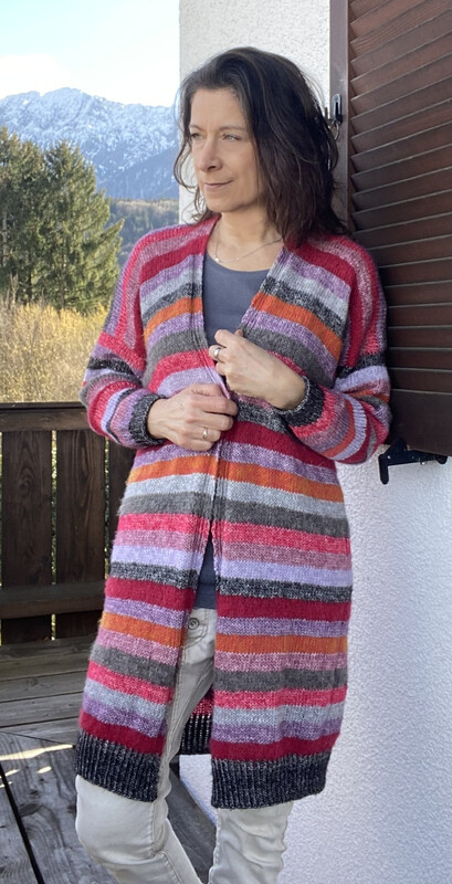 This cardigan is meant to inspire and encourage you to stripe with as many colors as you’d like and play with different yarn bases and fibres.