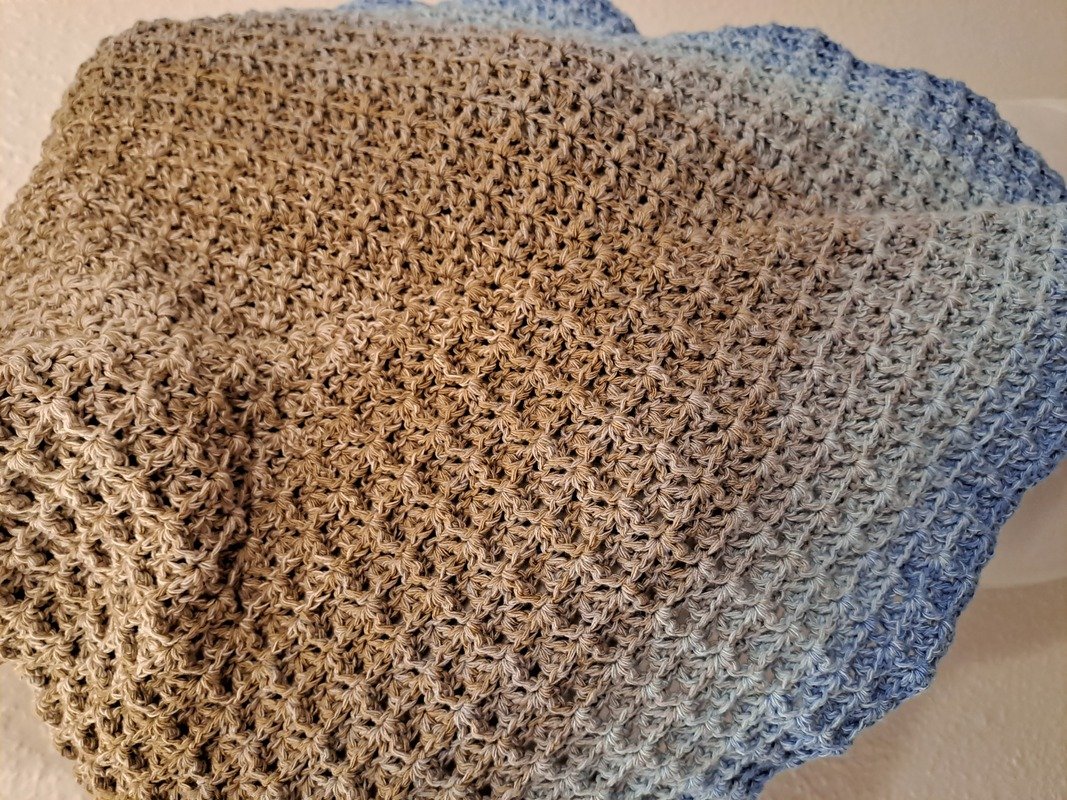 Ich habe mit einem 4fädigen 1000 m Farbverlaufsbobbel und einer Häkelnadel mit Stärke 4,0 gearbeitet