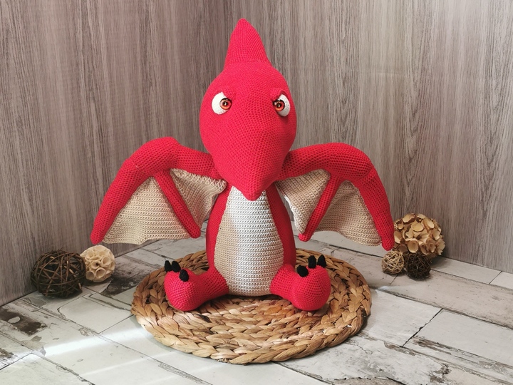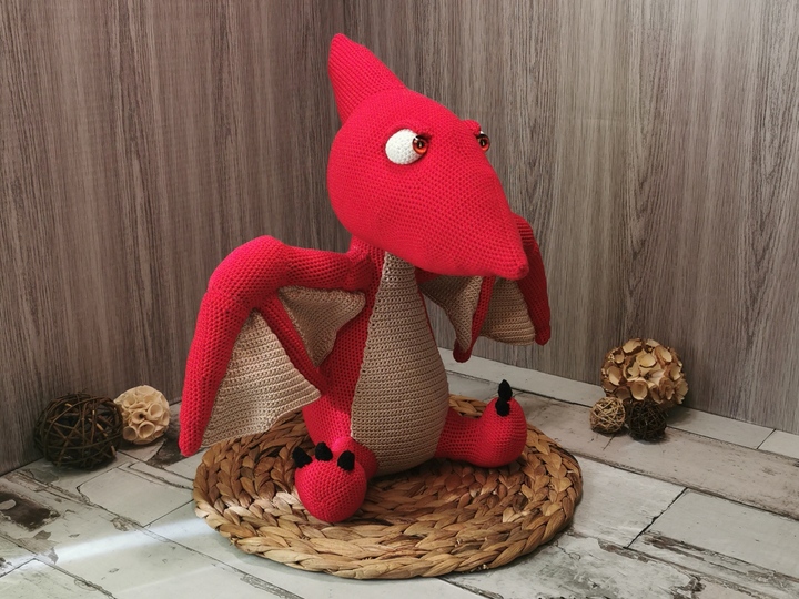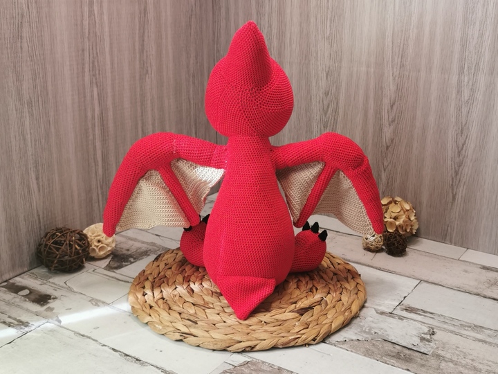 The finished Dino will be about 42cm wide. Of course, the size can vary depending on whether you crochet tight or loose. The choice of wool is also important. I crochet with cotton yarn 4ply 125m/50g (100% cotton).