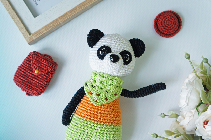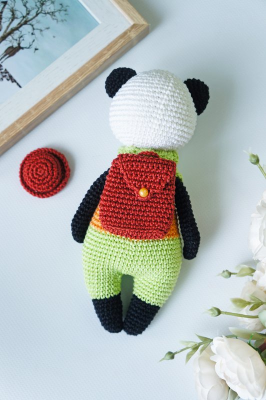Panda Bamboo wears a hat and always walks with a backpack where you can put something.