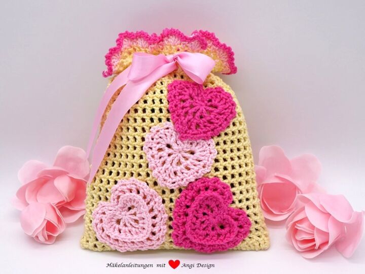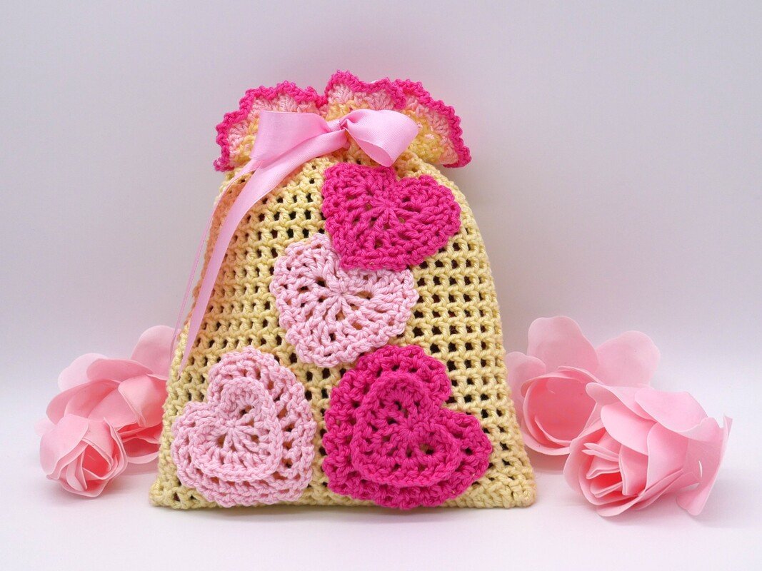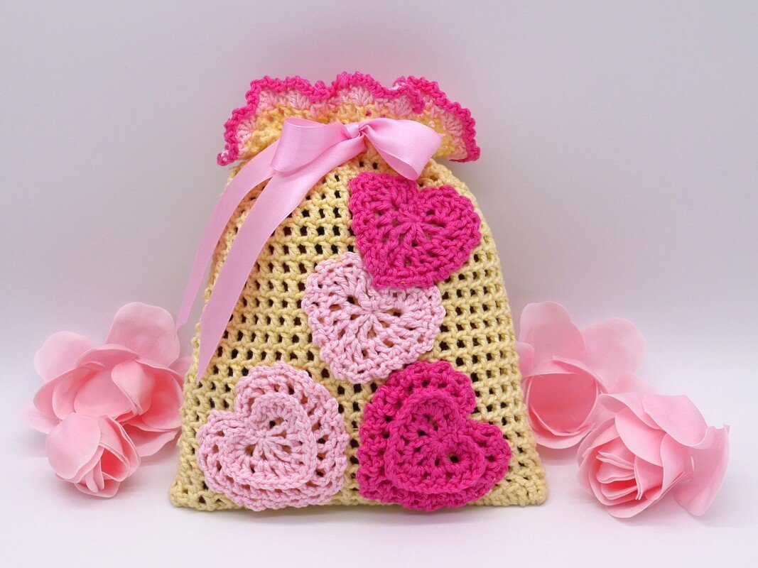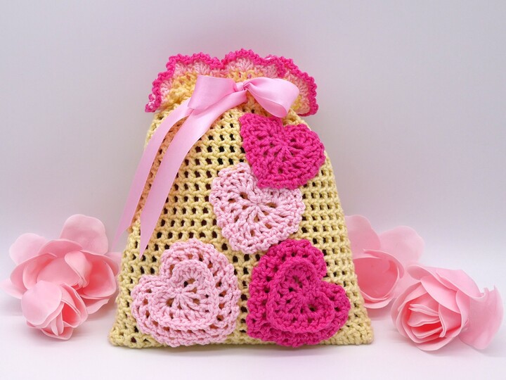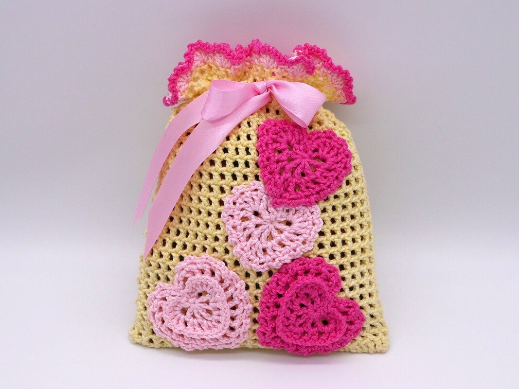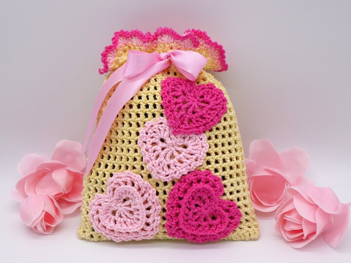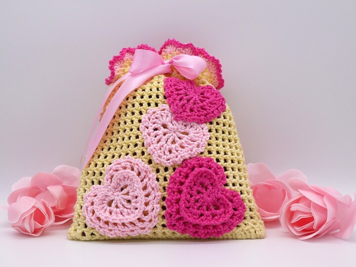 Gehäkelte Geschenksäckchen mit Herzen / PDF-Anleitung downloaden.