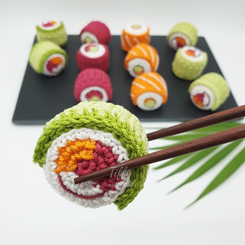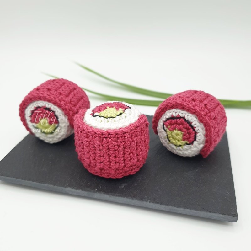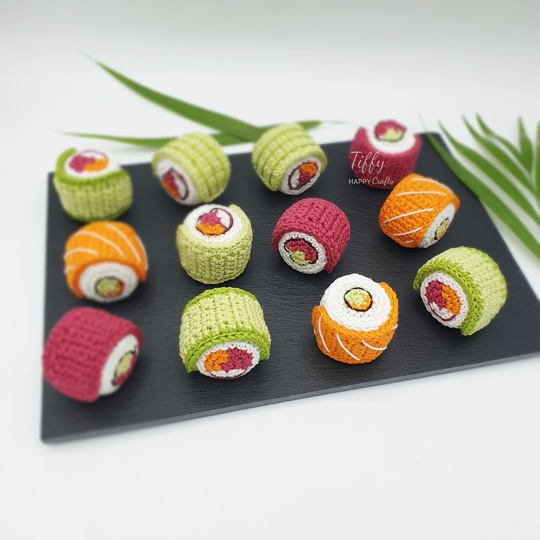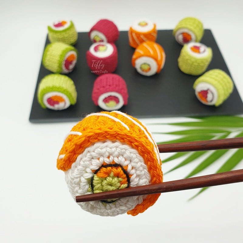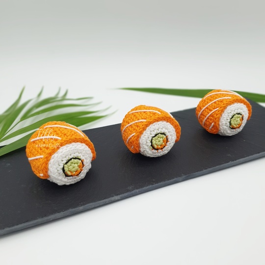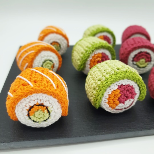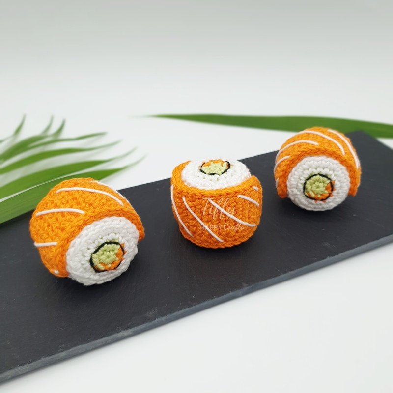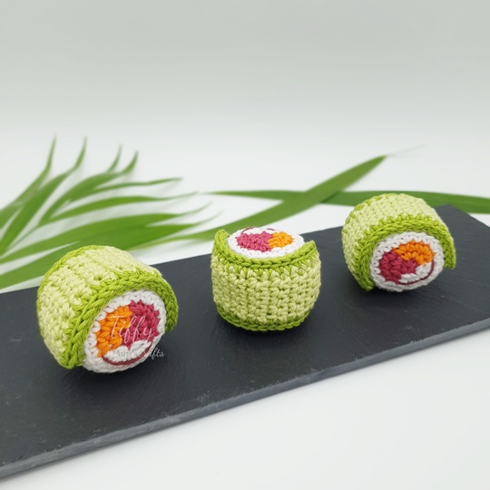 California Roll - Inside Out Sushi or Uramaki Sushi is very easy to follow with a lot of photos. You can make it as a gift for someone who loves Sushi or as a toy for kids. Do not hesitate to make your own cute amigurumi. I'm sure they will love these Sushi.