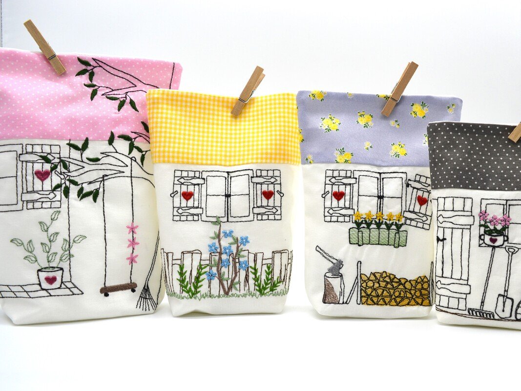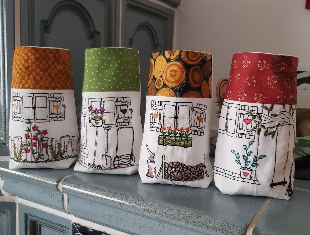 bestickt mit unterschiedlichen Motiven: uriges Fenster mit Zaun oder Hozstoß, Haus mit Baum und Schaukel, Schupfen mit Gartengeräten.