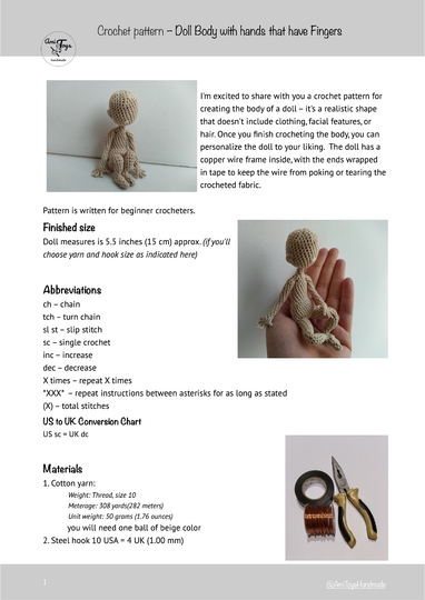 I'm excited to share with you a crochet pattern for creating the body of a doll's body featuring fingers on the hands. It's a realistic shape that doesn't include clothing, facial features, or hair. Once you finish crocheting the body, you can decorate the doll to your liking.