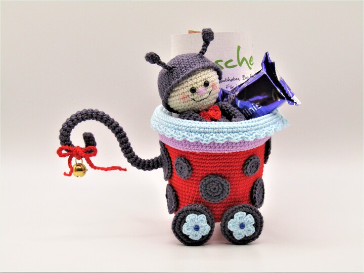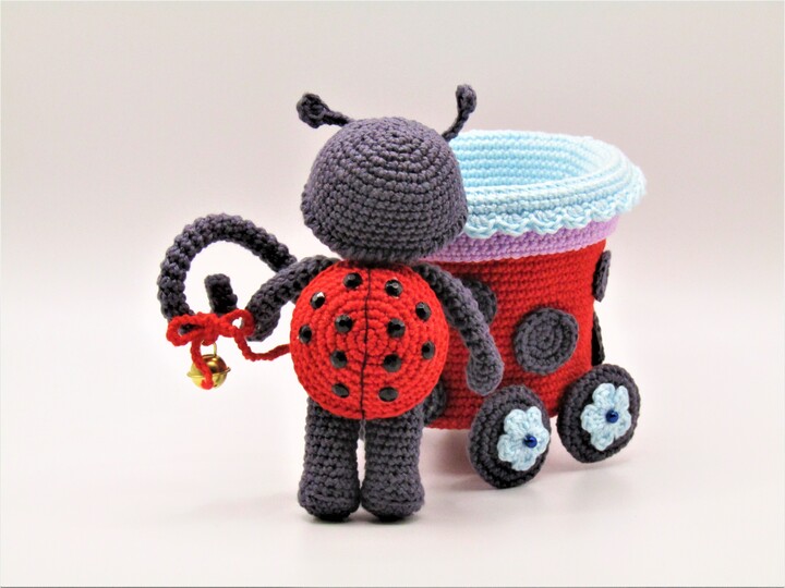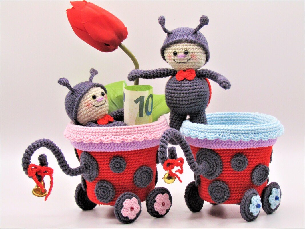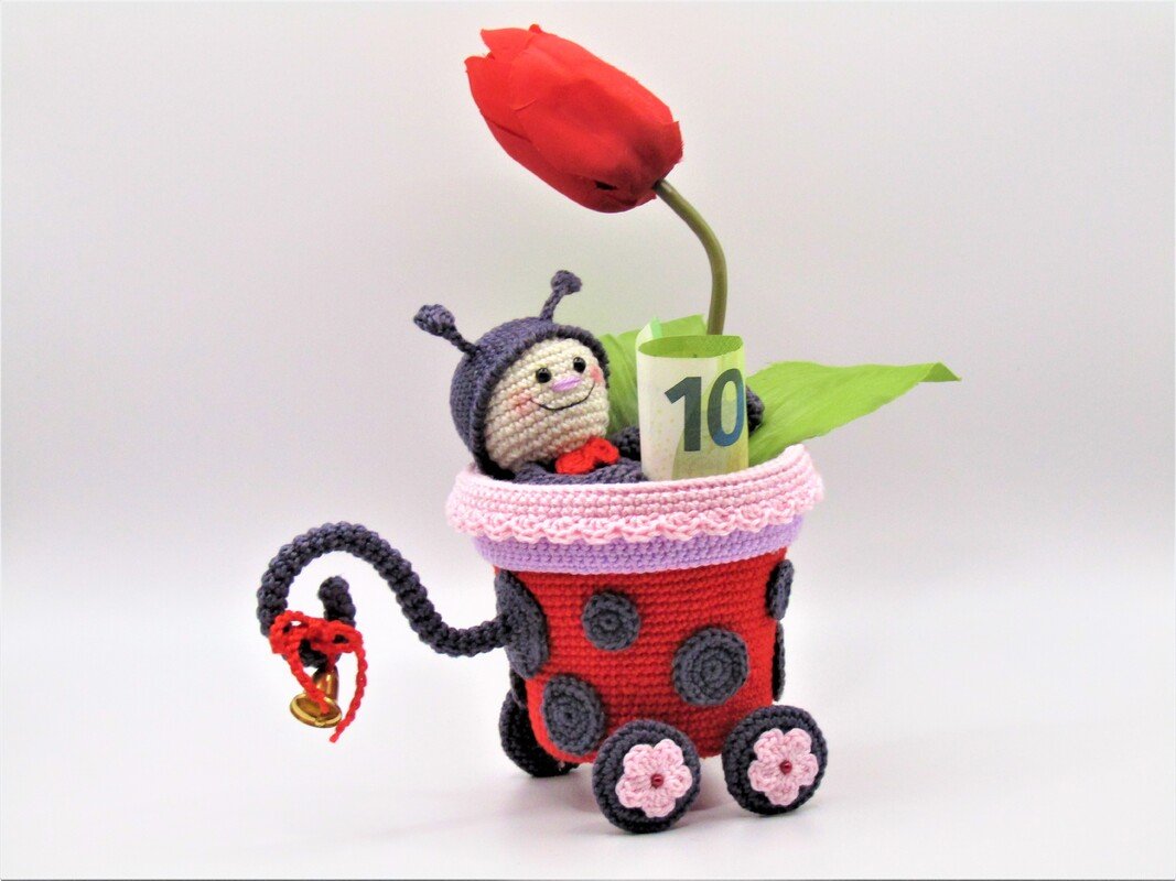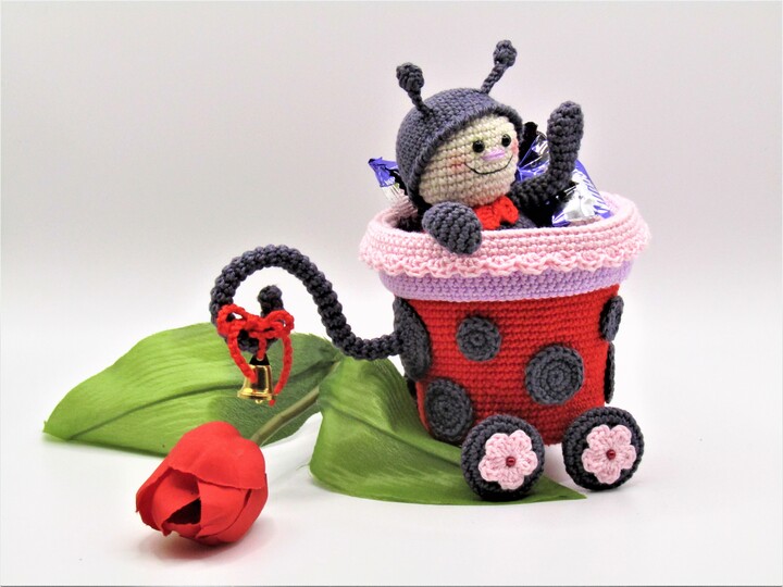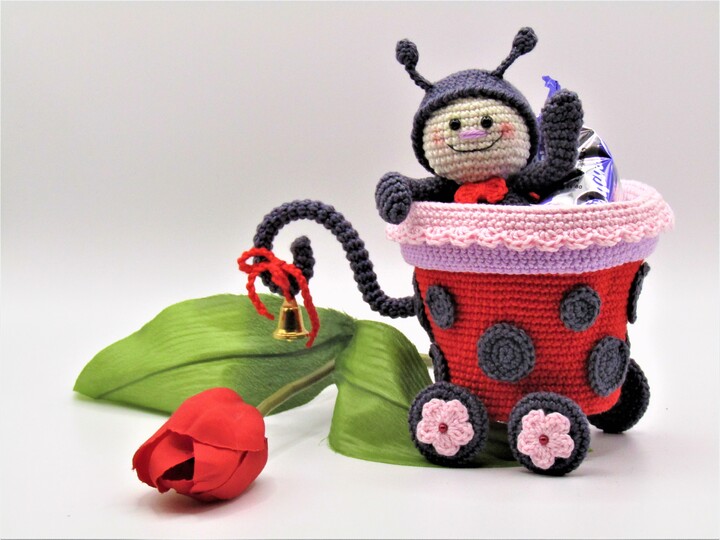 Größe der Figur: Wagen 10 cm Höhe, 8,5 cm Durchmesser, Marienkäferlein 12 cm.