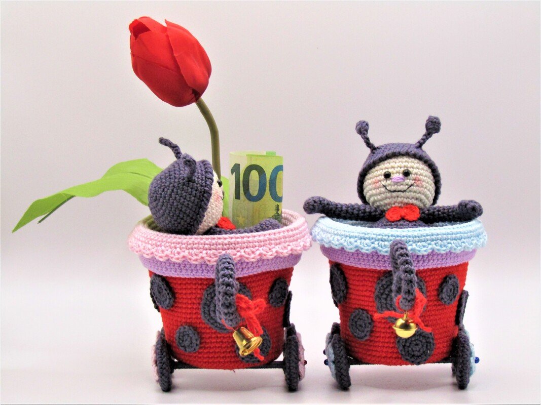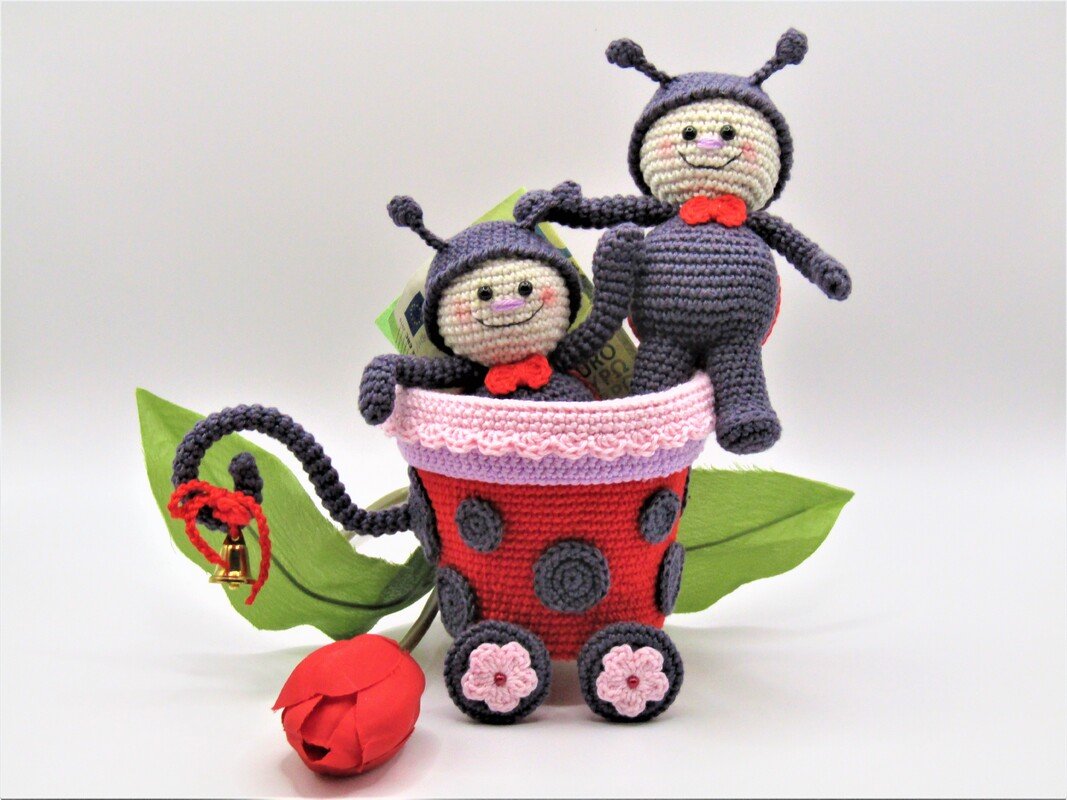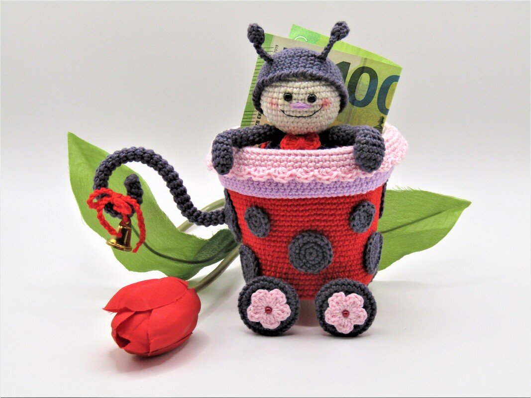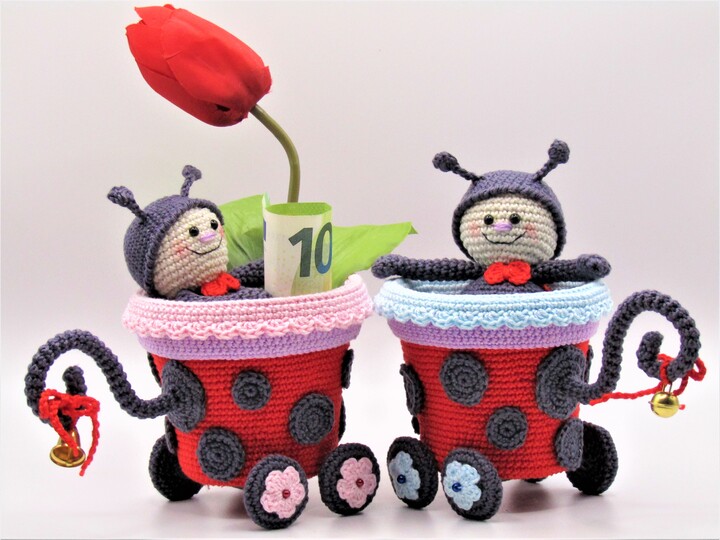 Größe der Figur: Wagen 10 cm Höhe, 8,5 cm Durchmesser, Marienkäferlein 12 cm.