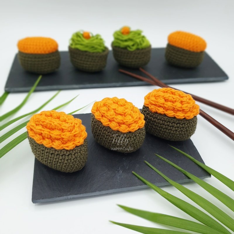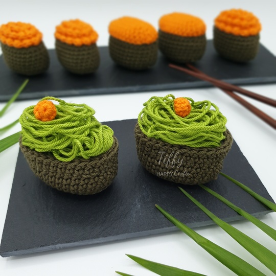 Gunkanmaki Sushi is very easy to follow with a lot of photos. You can make it as a gift for someone who loves Sushi or as a toy for kids. Do not hesitate to make your own cute amigurumi. I'm sure they will love these Sushi.