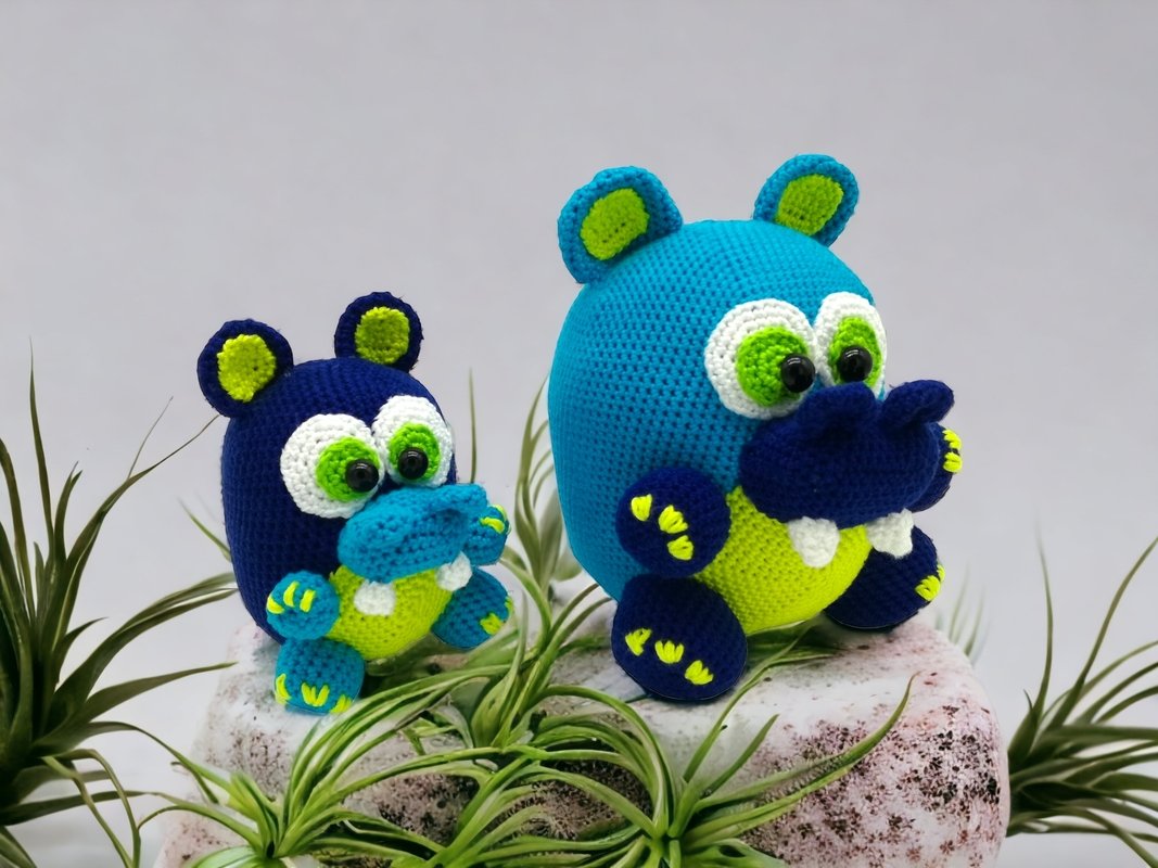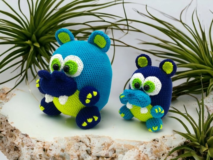 The finished hippo`s will be about 15cm and 12cm. Of course, the size can vary depending on whether you crochet tight or loose. The choice of wool is also important. I crochet with cotton yarn 4 ply 125m/50g (100% cotton).