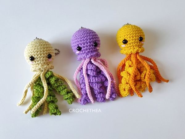 This little jellyfish can be crocheted with your favorite colors combination. It is perfect as a gift, keychain or bag charm.