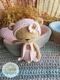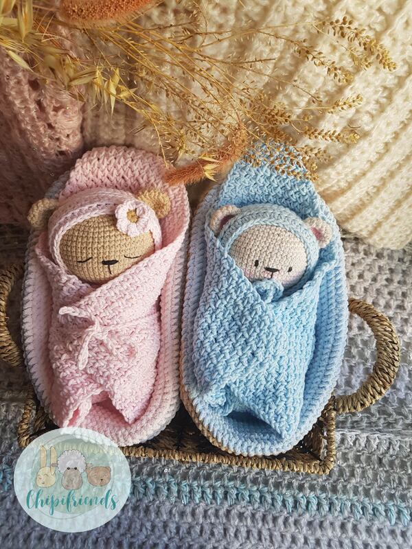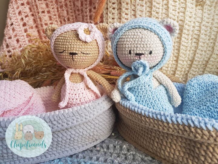 The crib is 27cm long, crocheted with chenille yarn (thick fluffy) and hook size 4mm.