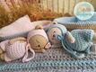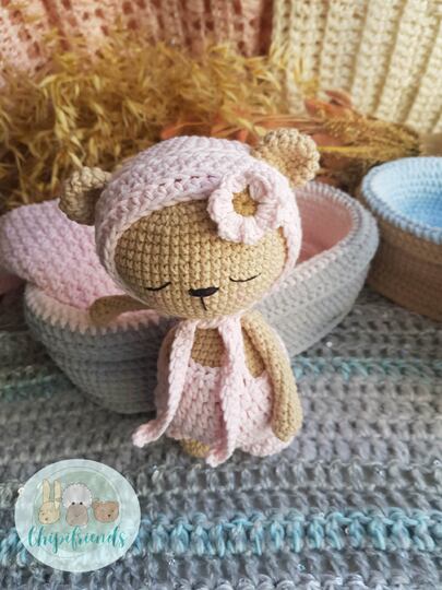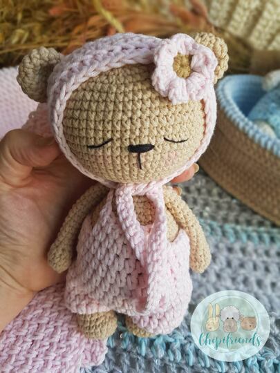 The pattern shows how to crochet the baby bears along with the crib and a blanket. The clothes are crocheted separately and you can dress and undress it.