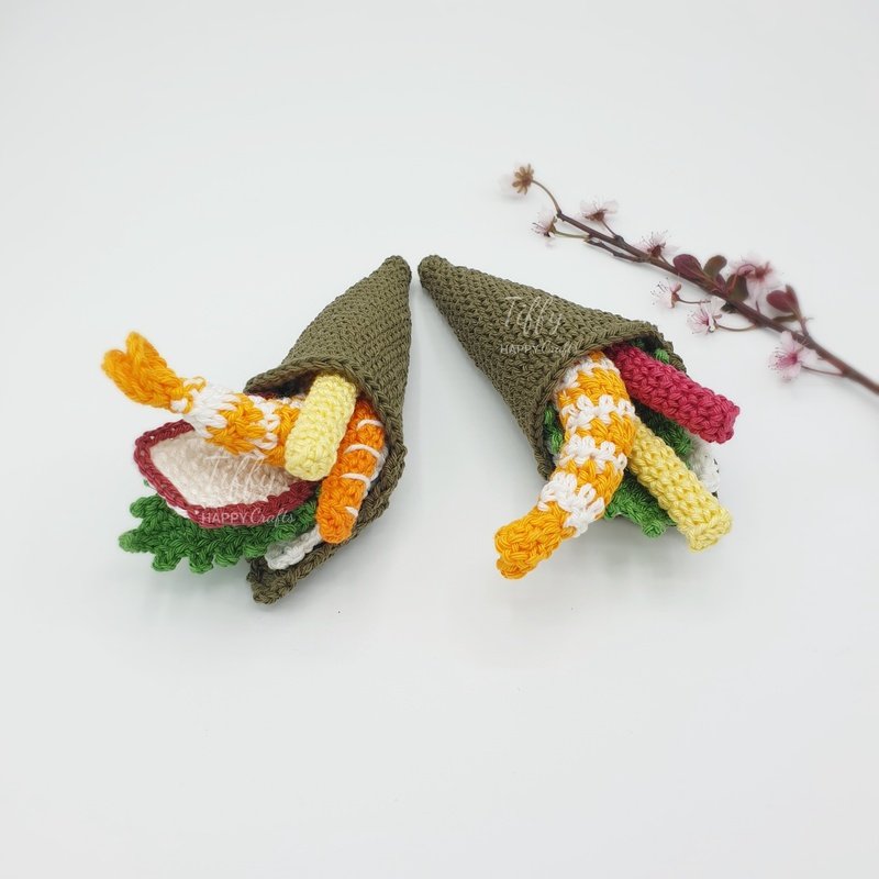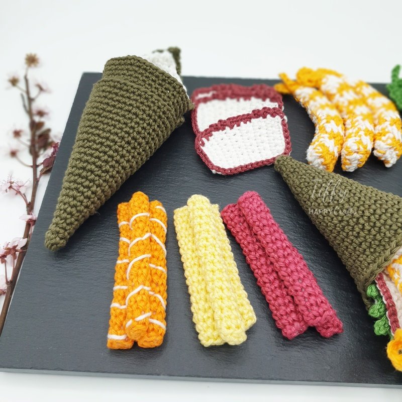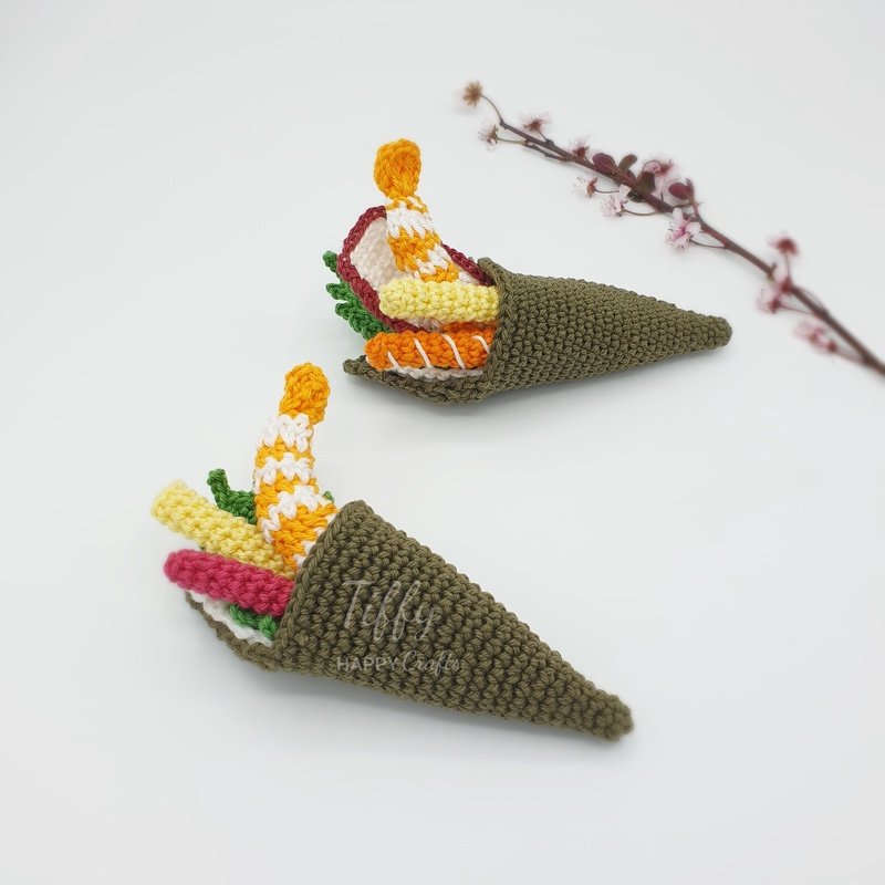 Crochet your own Temaki Sushi for a play kitchen or market stand! This detailed pattern guides you step by step in creating a realistic sushi hand roll with filling. Perfect as an accessory for little chefs or as a creative gift for sushi lovers.