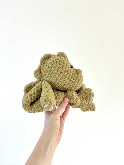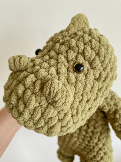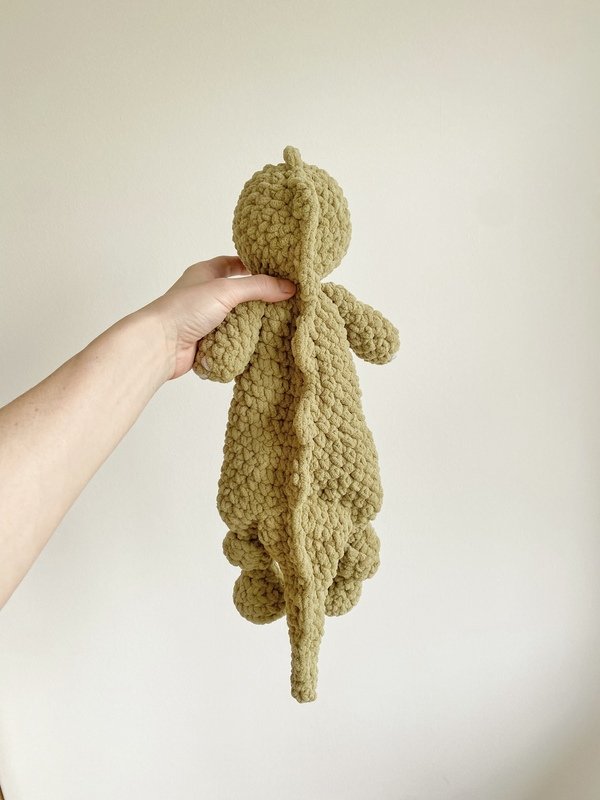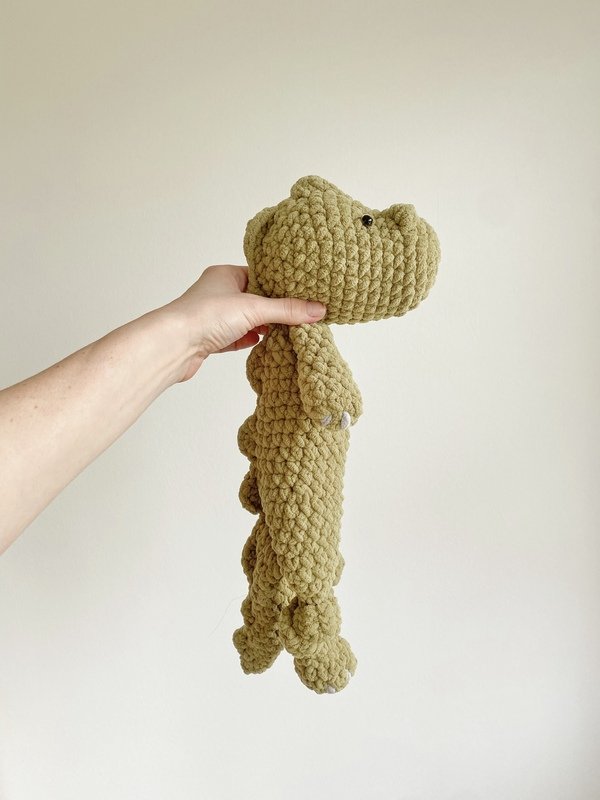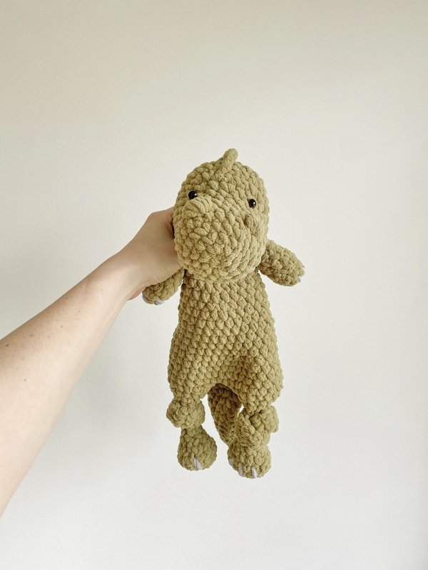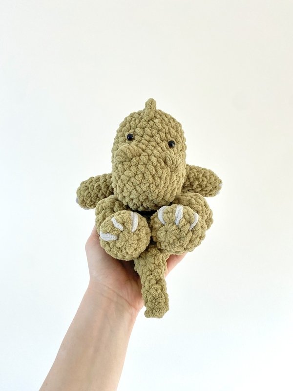 Dino T-Rex named Tim to cuddle. This dinosaur T-Rex cuddly toy crochet tutorial includes two eye options: Safety eyes and embroidered sleepy eyes.