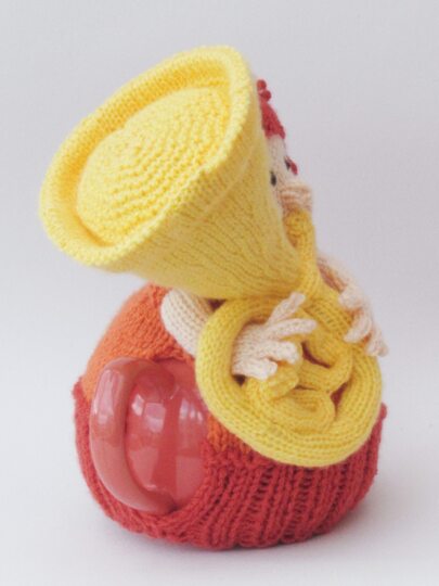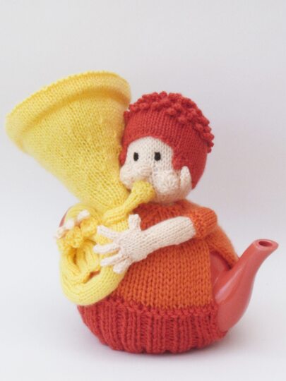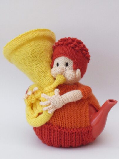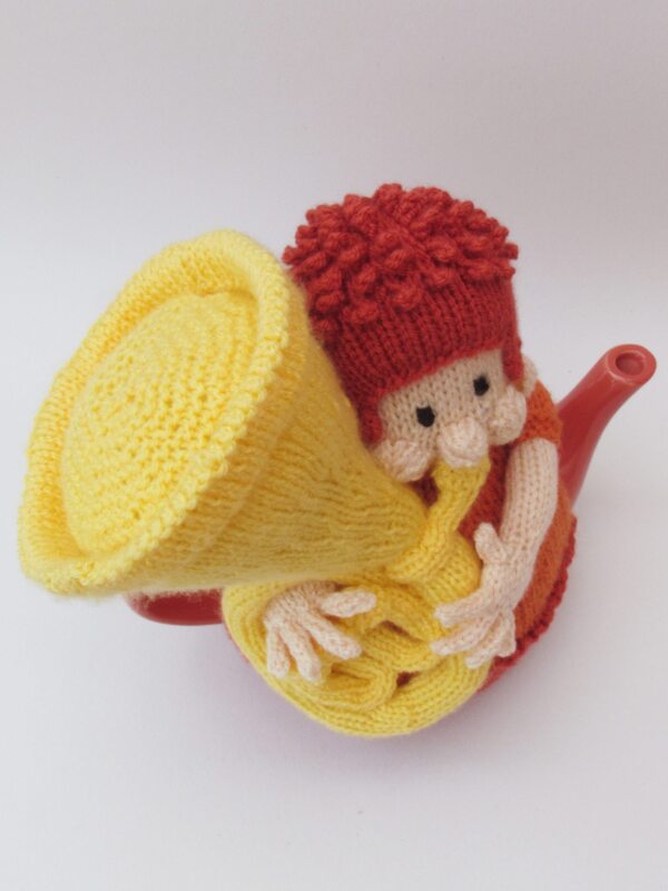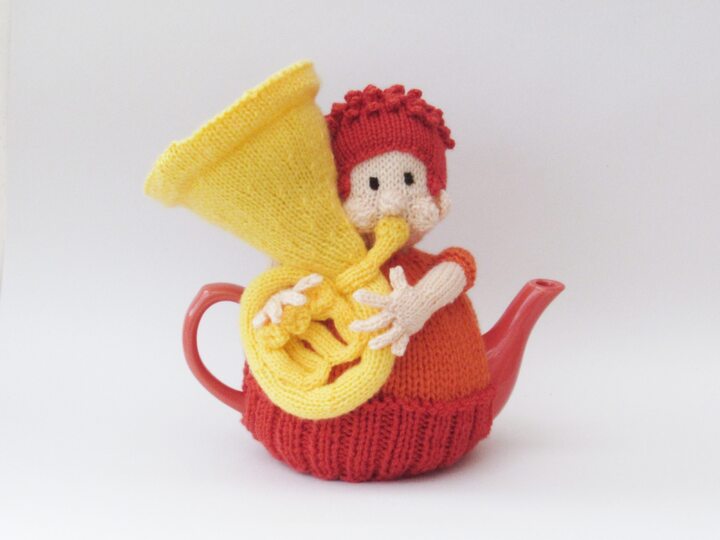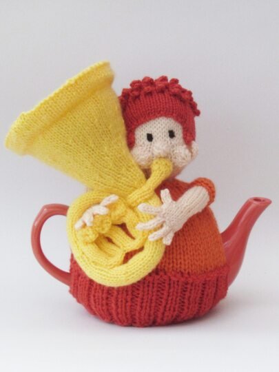 TeaCosyFolk's Tuba Player Tea Cosy Knitting Pattern is new and exciting and is a wonderful teatime tribute to tubists and brass band players.