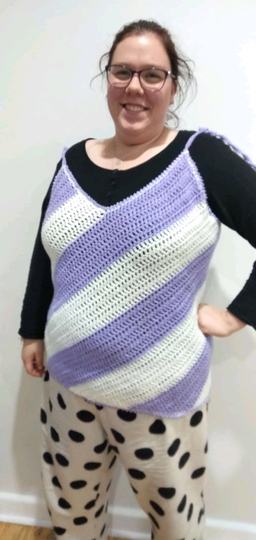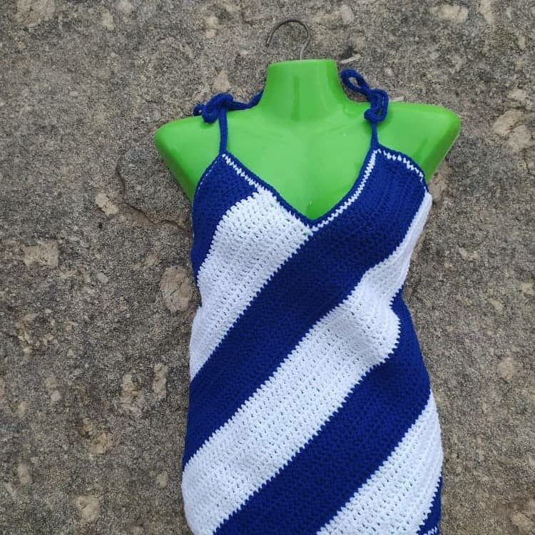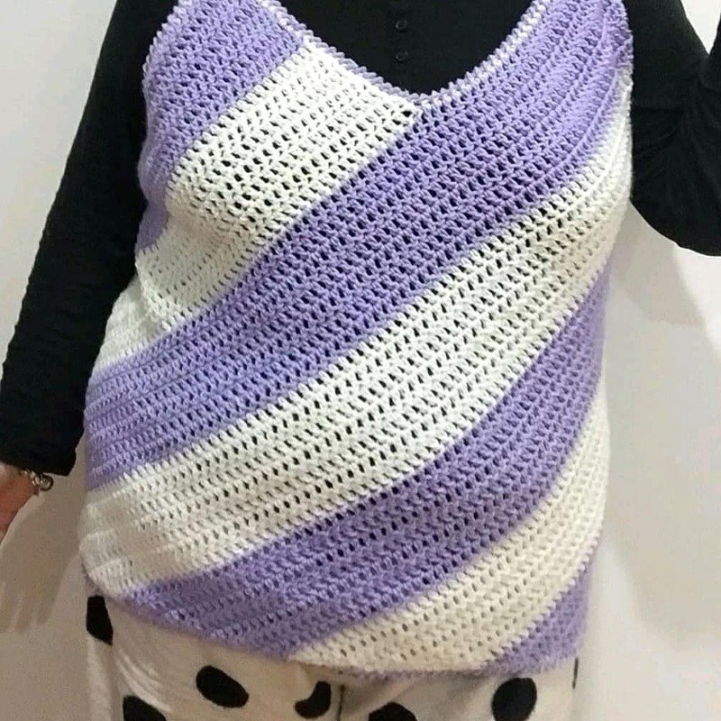 This pattern is for crochet diagonal tank top. It is worked in stripes. It’s beginner friendly as it makes use of simple crochet stitches. It will make a great addition to your wardrobe. It takes about 600-900 yards of yarn. It’s seamed. Contains instructions for bust size 30-50.