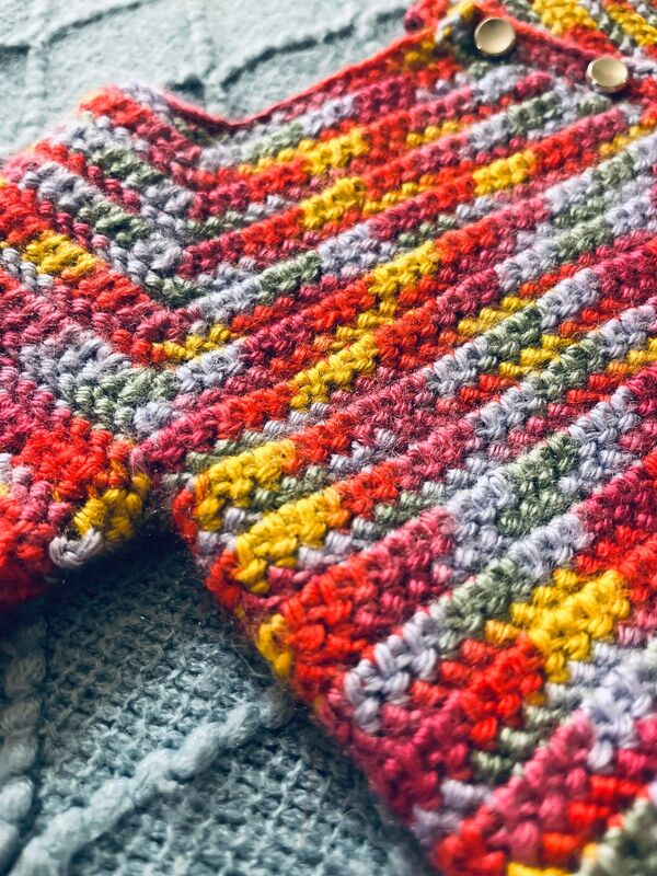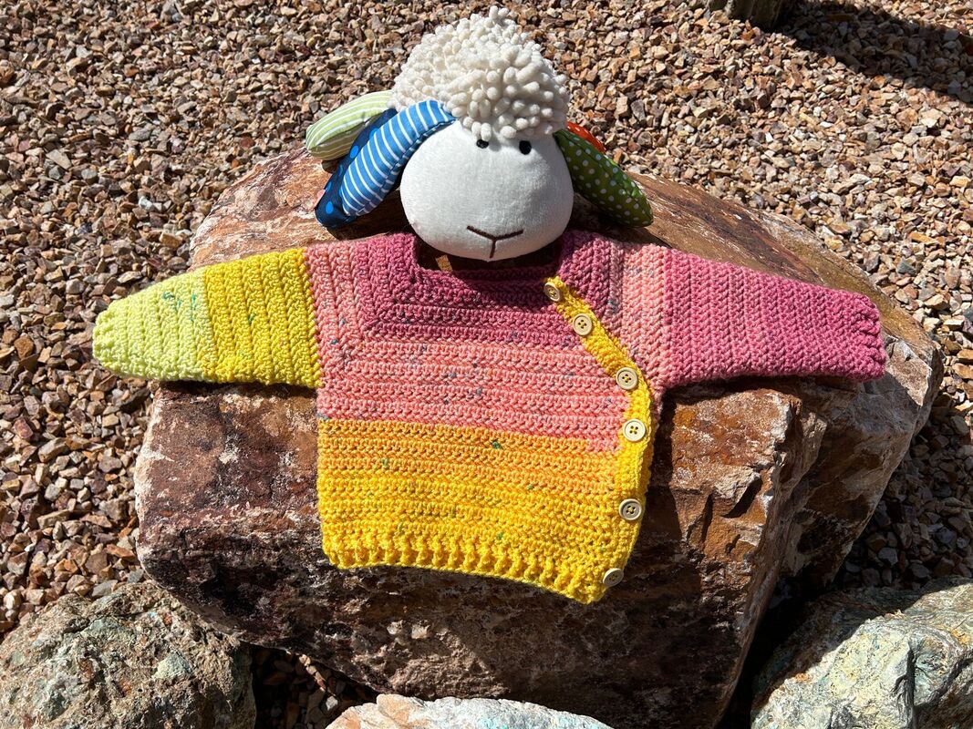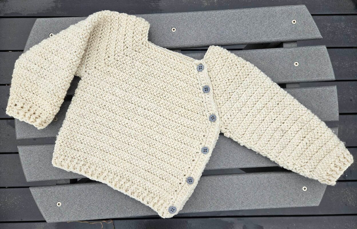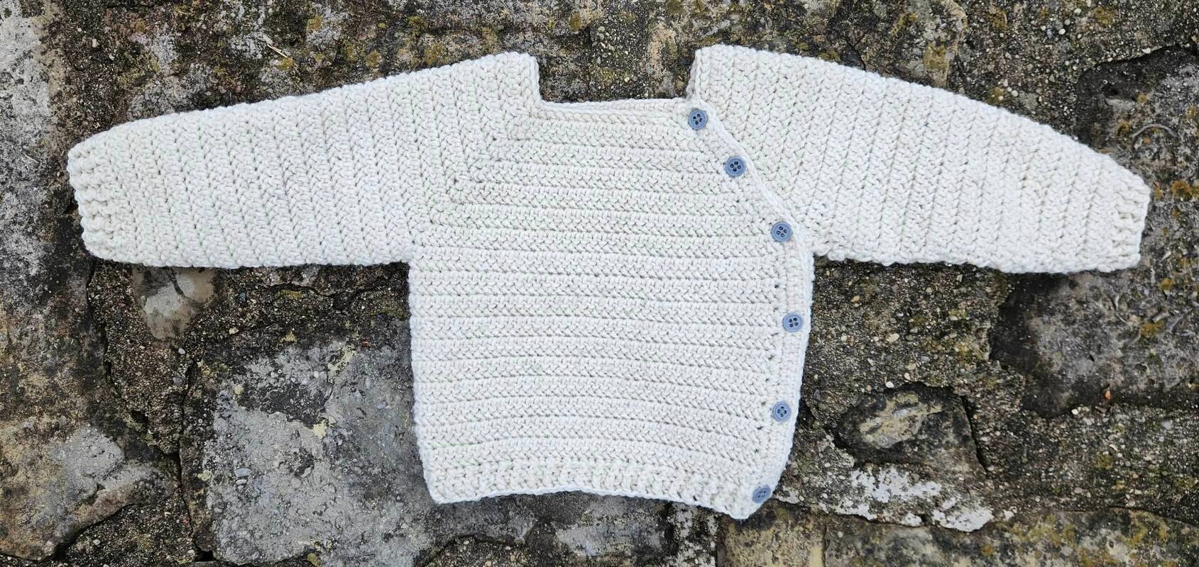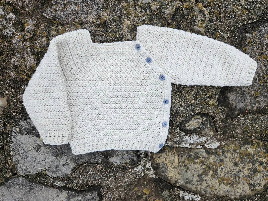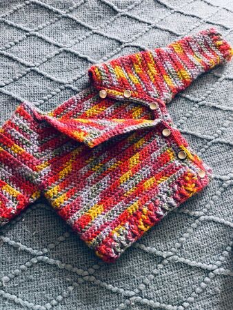 The asymmetric crochet baby cardigan is a very simple pattern with a beautiful button opening which opens all the way to the end. It is a very beginner friendly pattern. It contains instructions for sizes 0-6 months up 24 months.