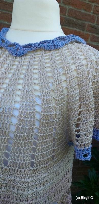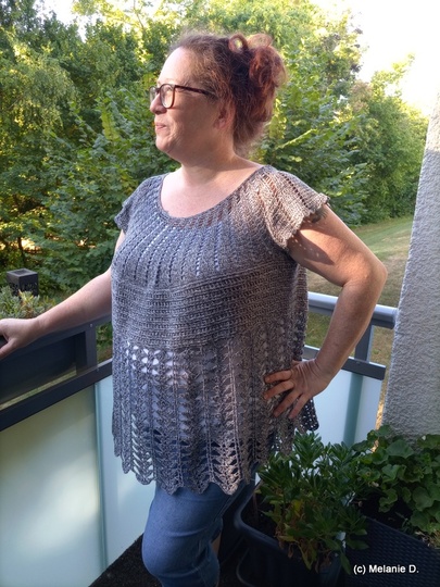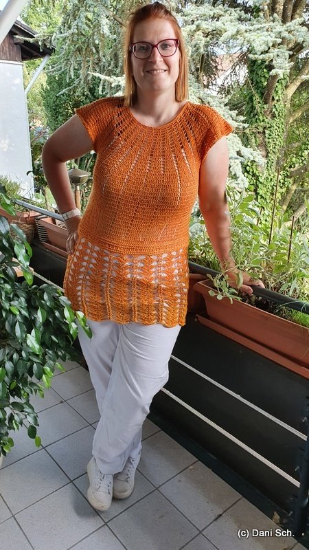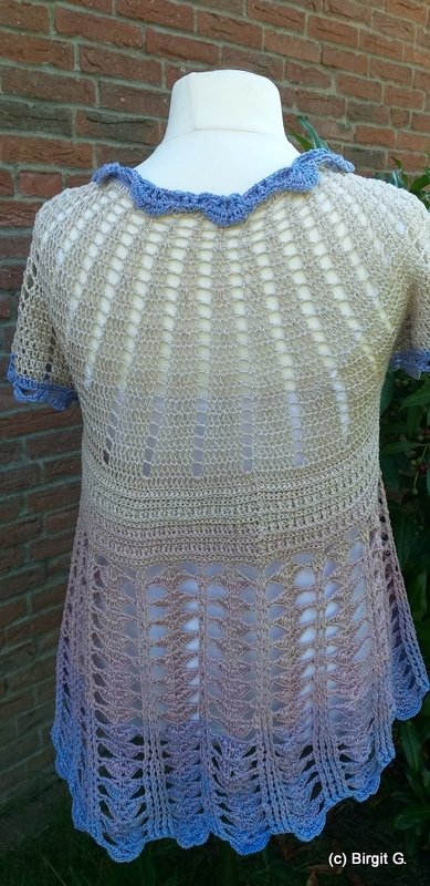 The cover picture was worked for size (EU) 38/40. Here I used the Funny Hooks Bobbel Olerum 1300 m, 3-ply and just under 259 g with a Hooksize 3.25 mm.
