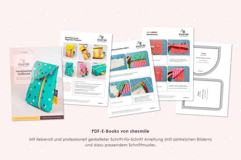 PDF-E-Books von shesmile: Diese leicht verständliche Schritt-für-Schritt-Anleitung mit vielen Fotos ist auch für Nähanfänger geeignet, denn die sehr ausführliche Fotoanleitung begleitet dich bei jedem Schritt.