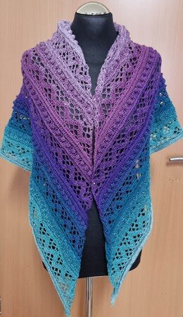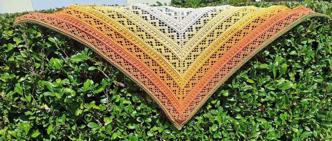 The triangular scarf Aglaia is a beautiful symmetric scarf that can be crocheted in any size, as the rows repeat.