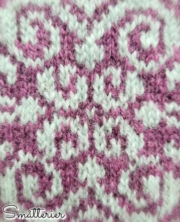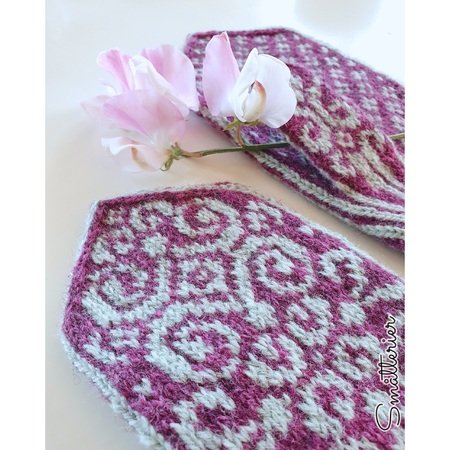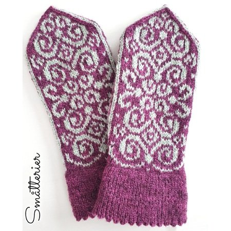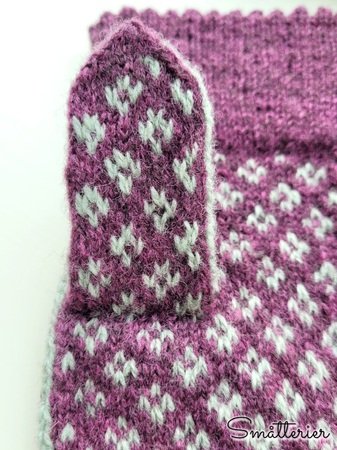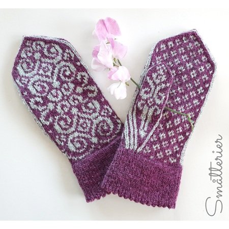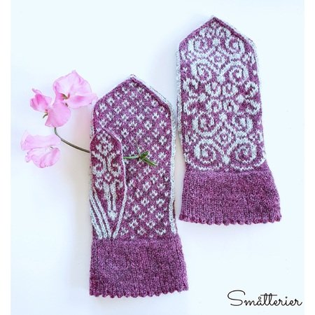 These mittens are worked in the Norwegian Selbu tradition, and the motif is inspired by old Selbu motifs. They were traditionally worked in black and white, but some times the black or white was replaced by red.