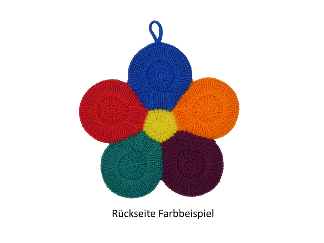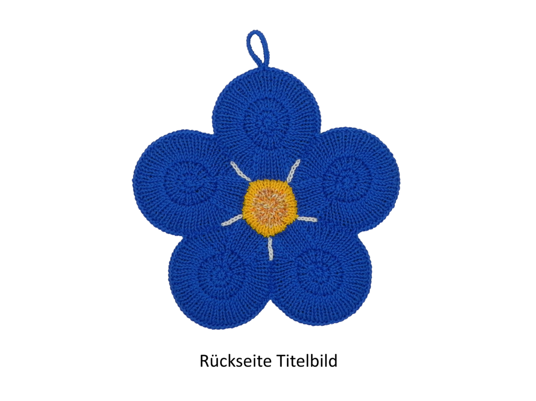 Diese PDF-Strickanleitung besteht aus 14 Seiten und enthält eine genaue Anleitung zum Stricken des Topflappens Vergissmeinnicht.