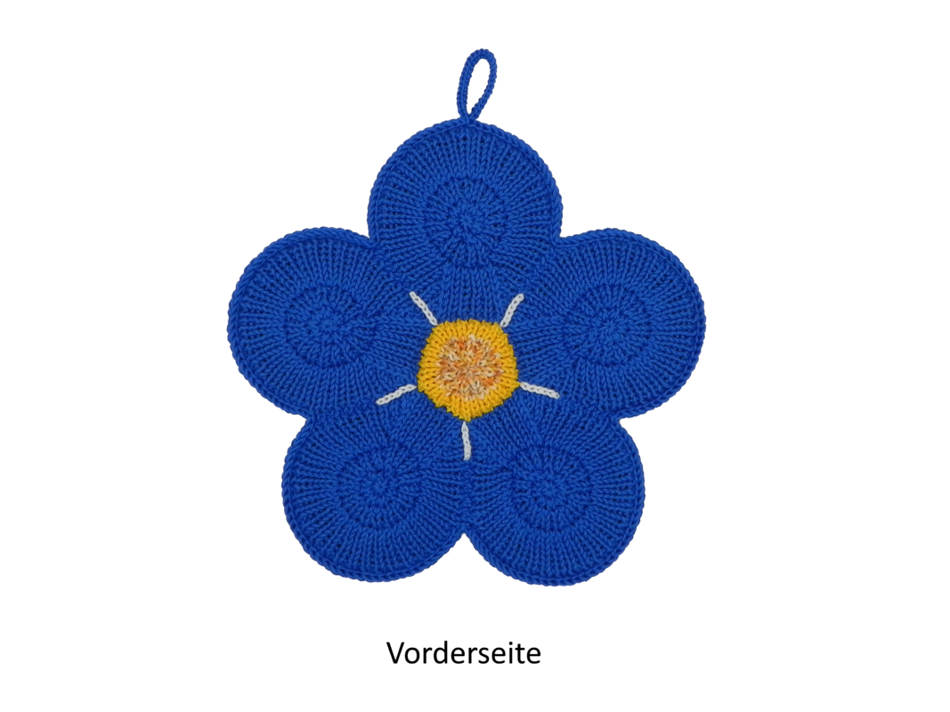 Dies ist eine Anleitung zur Herstellung eines gestrickten Topflappens in Form der Blume Vergissmeinnicht.