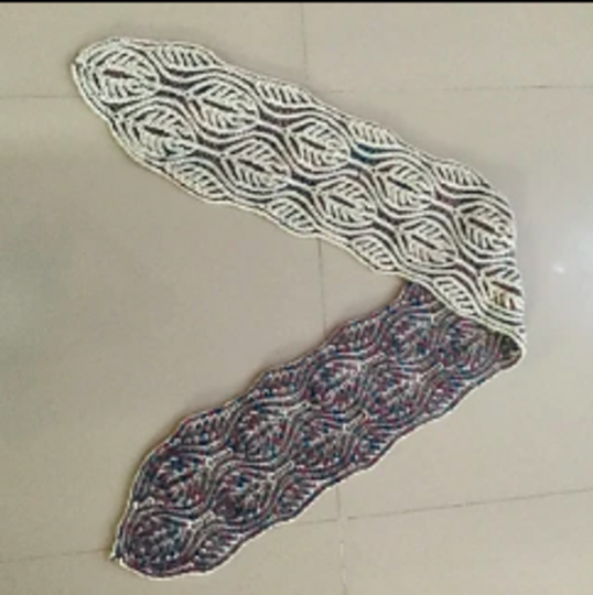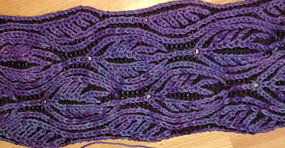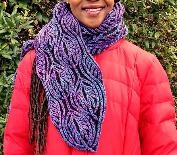 This beautiful scarf uses a dark background to make a variegated yarn stand out. It is reversible with dark leaves against a lighter background when you flip it over.