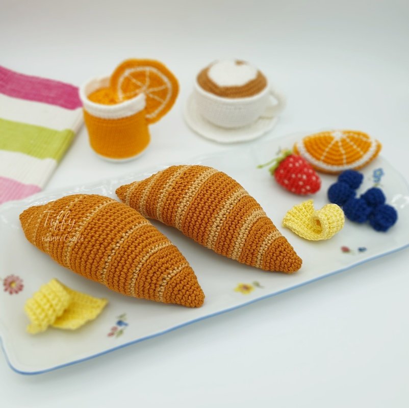 This adorable crochet croissant looks just like it came from a bakery! With its curved shape and soft stuffing, it’s the perfect addition to any play kitchen or pretend market stall. The pattern includes two versions: a smooth classic croissant and one with a textured surface for extra realism.